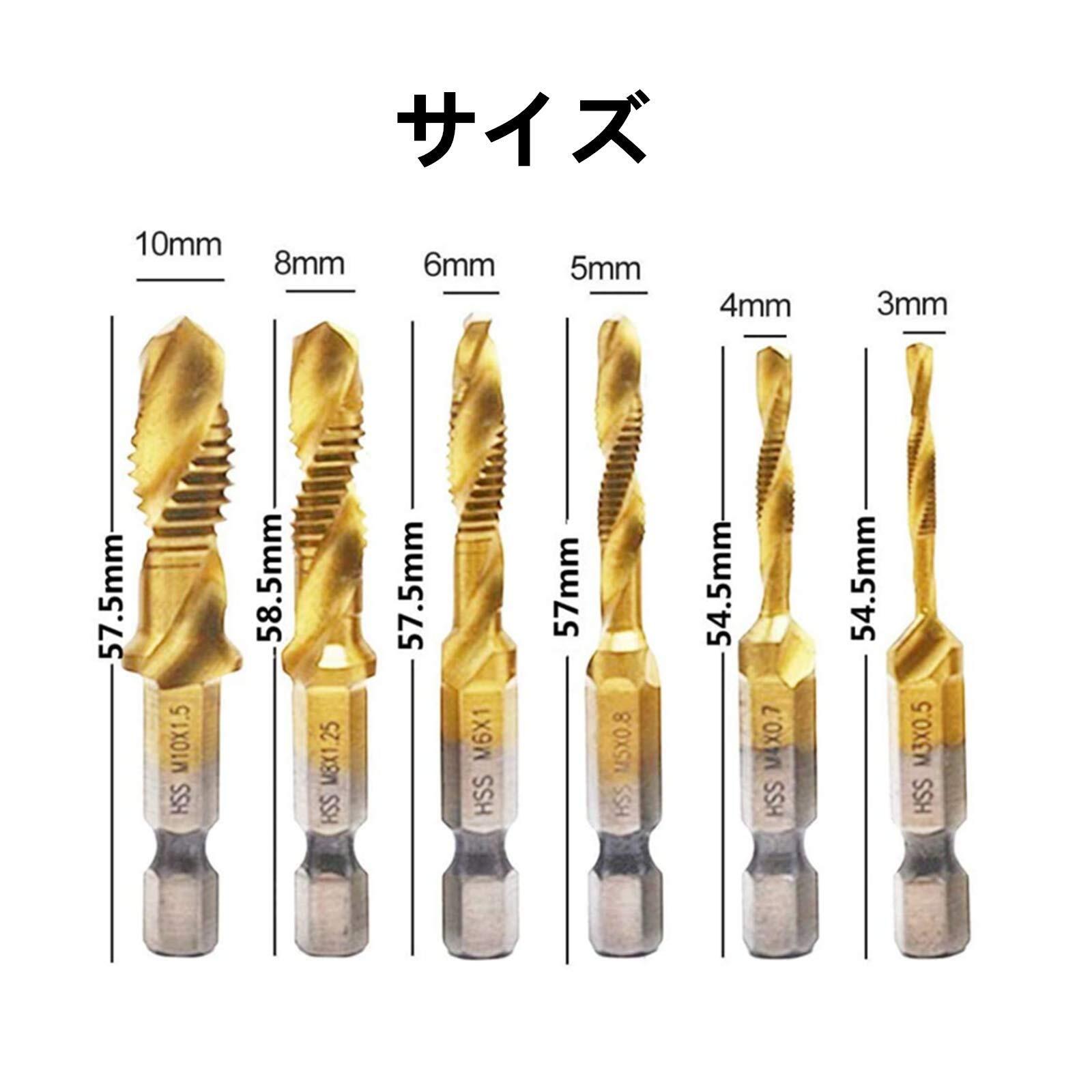 【商品仕様】材質:ハイス鋼(HSS)、硬度が高いです。サイズ:M3x0.5、M4x0.7、M5x0.8、M6x1、M8x1.25、M10x1.5の6本セットです。いろんな機種がありますから、いつでも自分のニーズに対して、自由に選択できます。インパクトドライバーやドリルドライバーなどに適用。