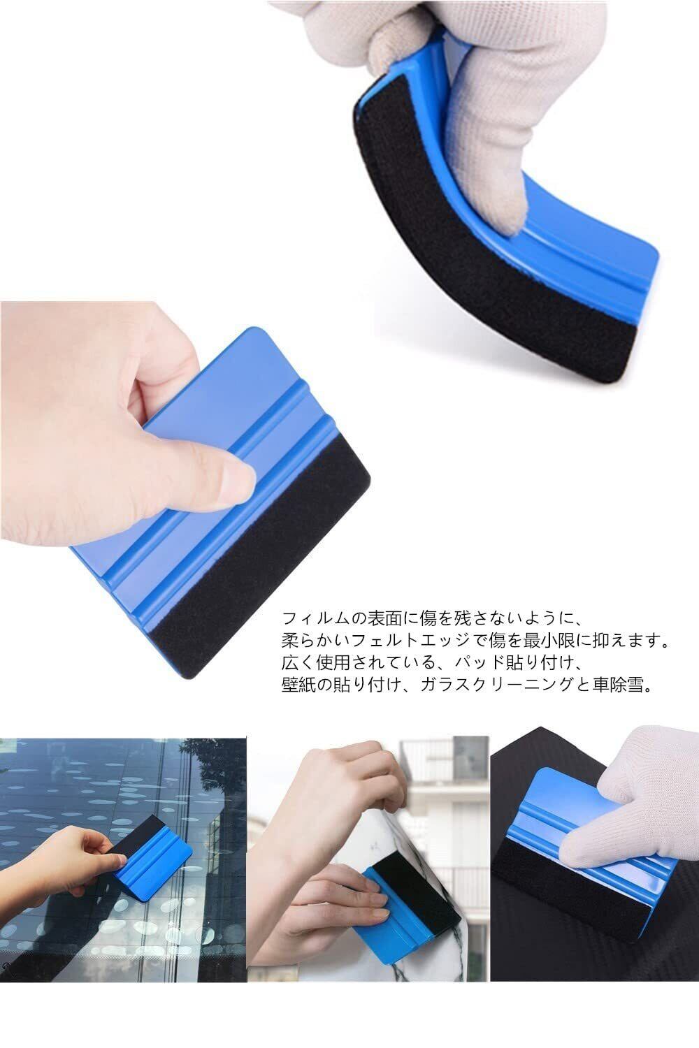 【パッケージ内容】フェルトスキージ*2、水切りワイパー*1、スクレーパー * 2、クラフトナイフ(5枚替刃) * 1 。ラッピングをスムーズに施工のため、組み合わせた工具です。