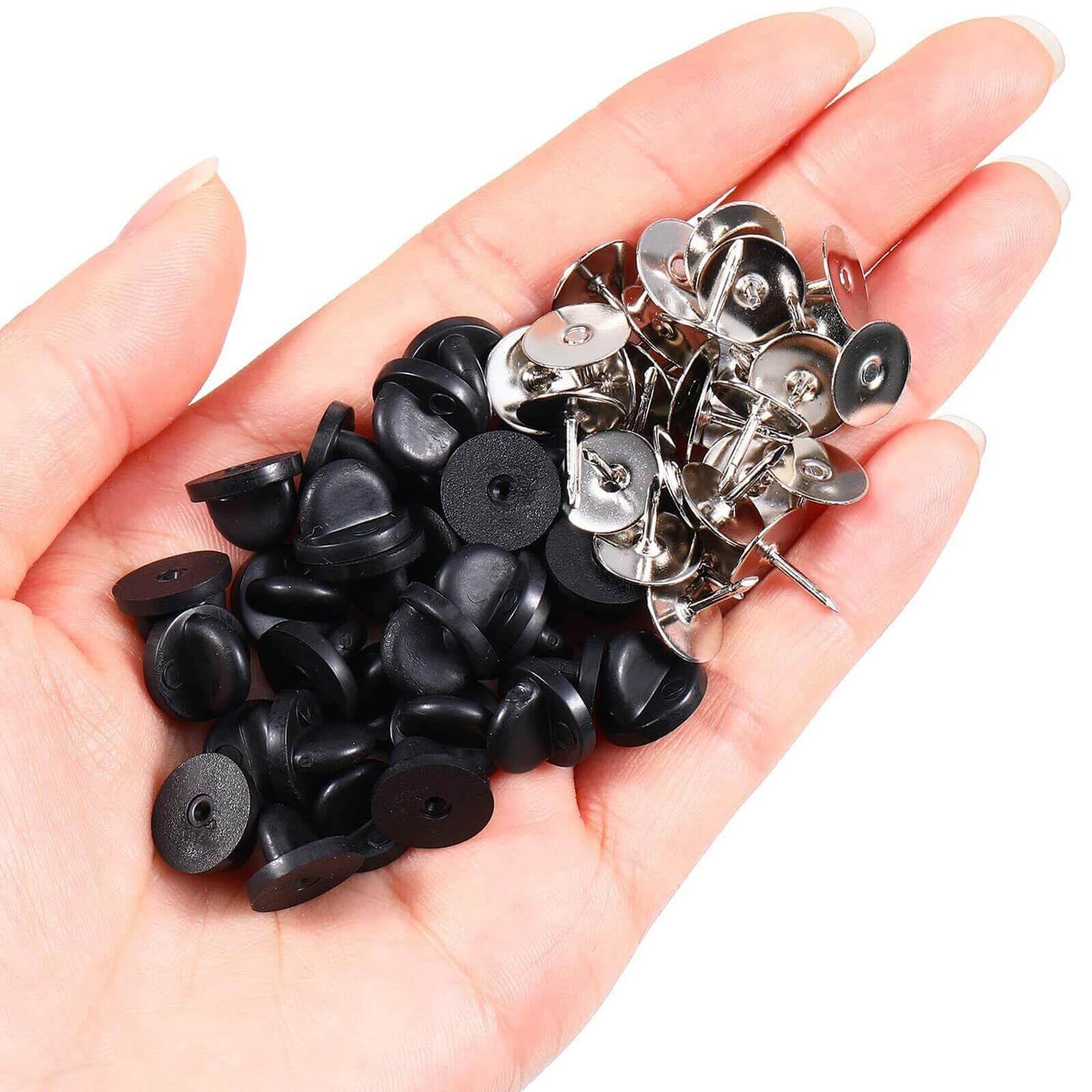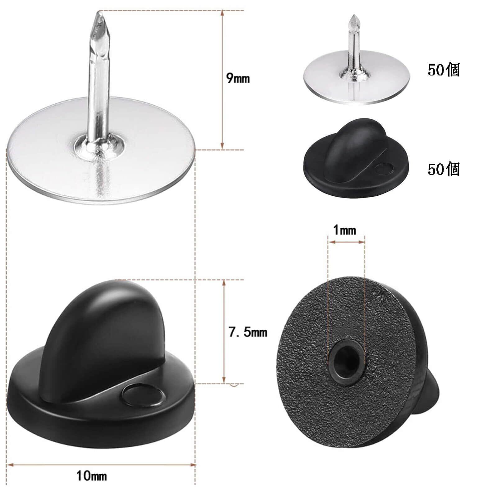 【商品仕様】サイズ:釘:10*9mm、ゴムキャップ:10*8mm、穴径1mm カラー:ブラック 内容:ピンバッジのキャッチ約50セット