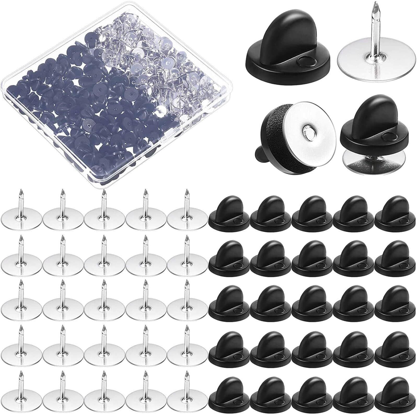 【数量限定】バッジ 留め具 ピンバッジのキャッチ 黒 50個セット 収納ケース付き 蝶タック バッジ 留め具 安全ピン 取付簡単 ピン付き パーツ ハンドメイド アクセサリーパーツ ブラックゴムキャップ約50個+釘約50個 | わくわくSHOP