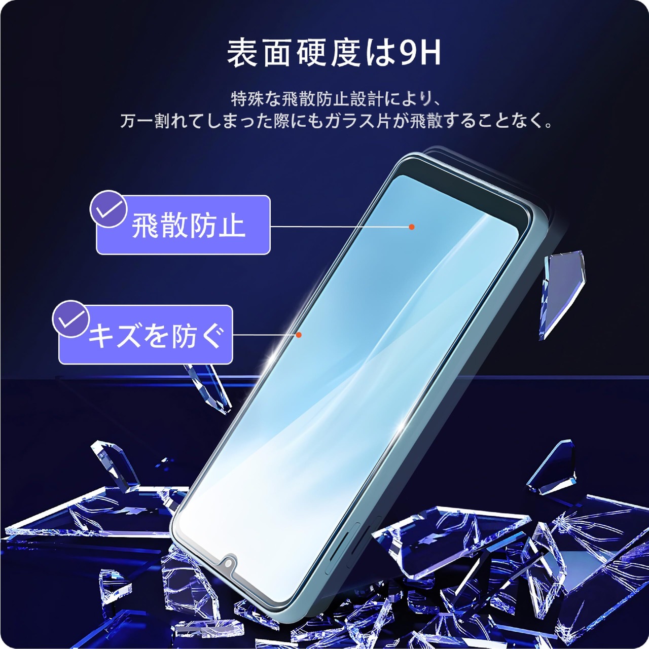 【日本製素材旭硝子製】硬度 9H (ナイフよりも硬い)の高品質な強化ガラスを採用し、ハードコーティング技術により外部からの衝撃をフィルムが吸収し、スマホを様々なものから保護し、鍵、コイン、砂などの傷を防ぎます。