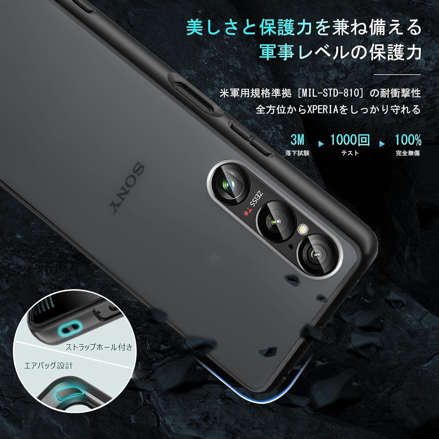 【四角防振クッション搭載と側面に優しい設計】端末が落下する場合は、角から落下した場合が割れる可能性が高いようなので、このケースは四隅の内側に衝撃を分散させる防震クッション設計。ケース側面にも柔軟性の高いTPU素材を使用、抜群な耐衝撃性を実現し、xperia1viを衝撃からしっかりと守れます。ケースの着脱も簡単、装着の際に傷つける心配はありません。