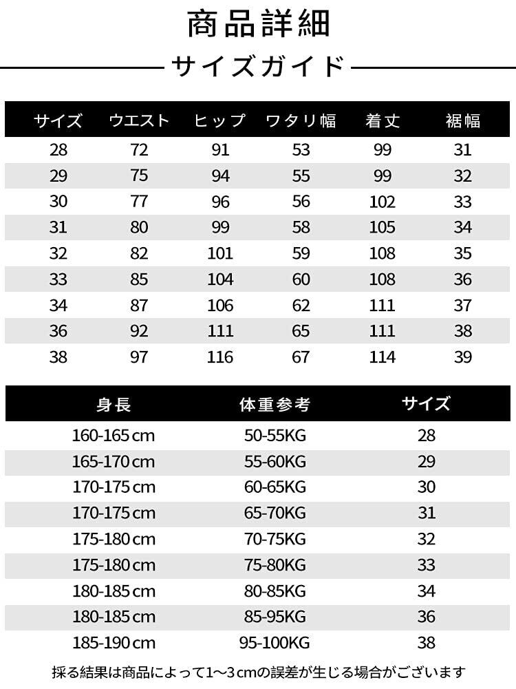 サイズ:30 ウエスト:77cm ヒップ:96cm ワタリ幅:56cm 着丈:102cm 裾幅:33cm サイズ:31 ウエスト:80cm ヒップ:99cm ワタリ幅:58cm 着丈:105cm 裾幅:34cm