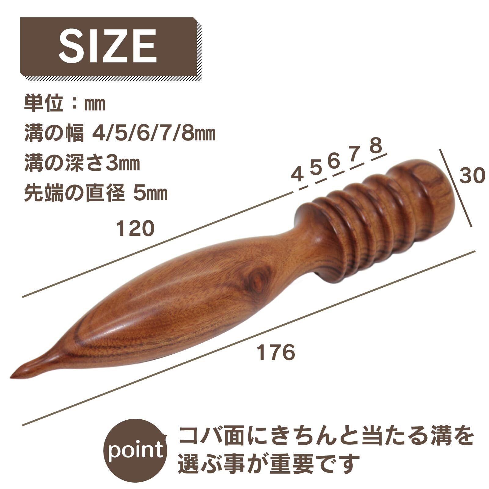 高級家具に使われているローズウッドで作られたウッドスリッカーで、コバ磨きに重要な繊維がしっかり詰まった硬さがあります。木材の持つ硬さは革によく馴染みツヤを引き出しコバの美しい仕上がりが期待できます。