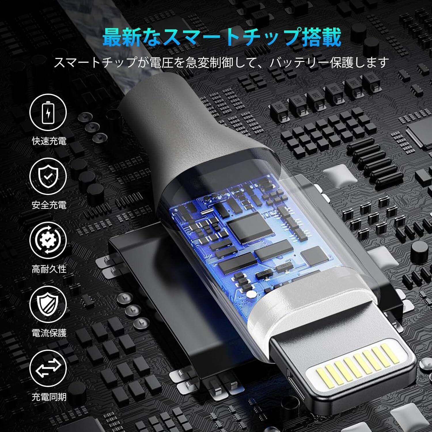 【MFi認証】:MFi認証済みの充電ケーブルなので、充電時のエラーメッセージが出る心配要らないです。コネクタ部分にスマートチップが内蔵されているため、過充電を防ぎ、安全かつ効率的に充電が可能です。MFi認証済みなので、iPhoneやiPadの安定した充電や同期が高速に行います。