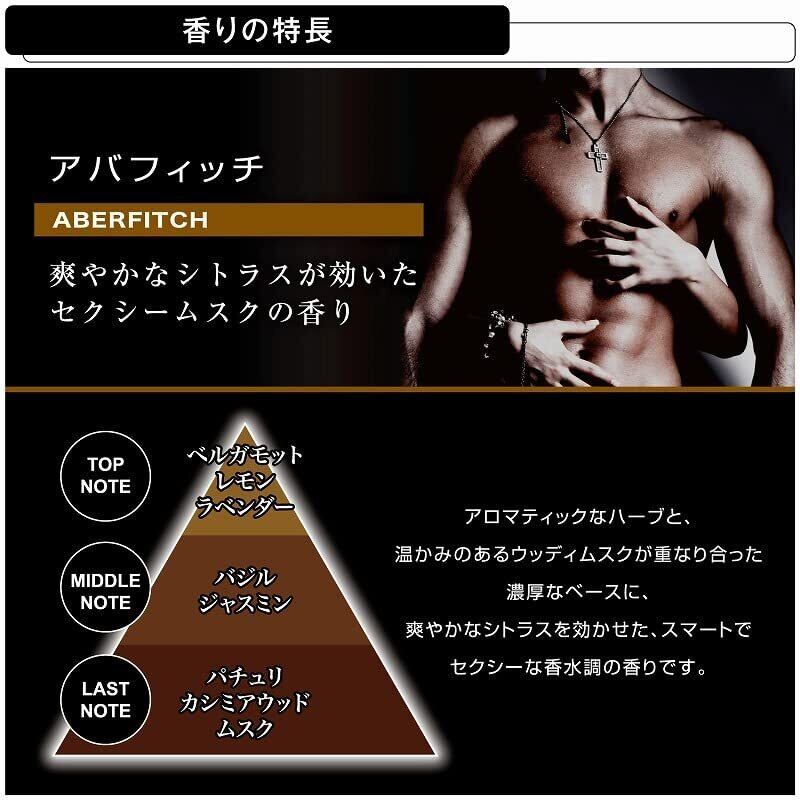 【アバフィッチの香り】 アロマティックなハーブと、温かみのあるウッディムスクが重なり合った濃厚なベースに、爽やかなシトラスを効かせた、スマートでセクシーな香水調の香りです。