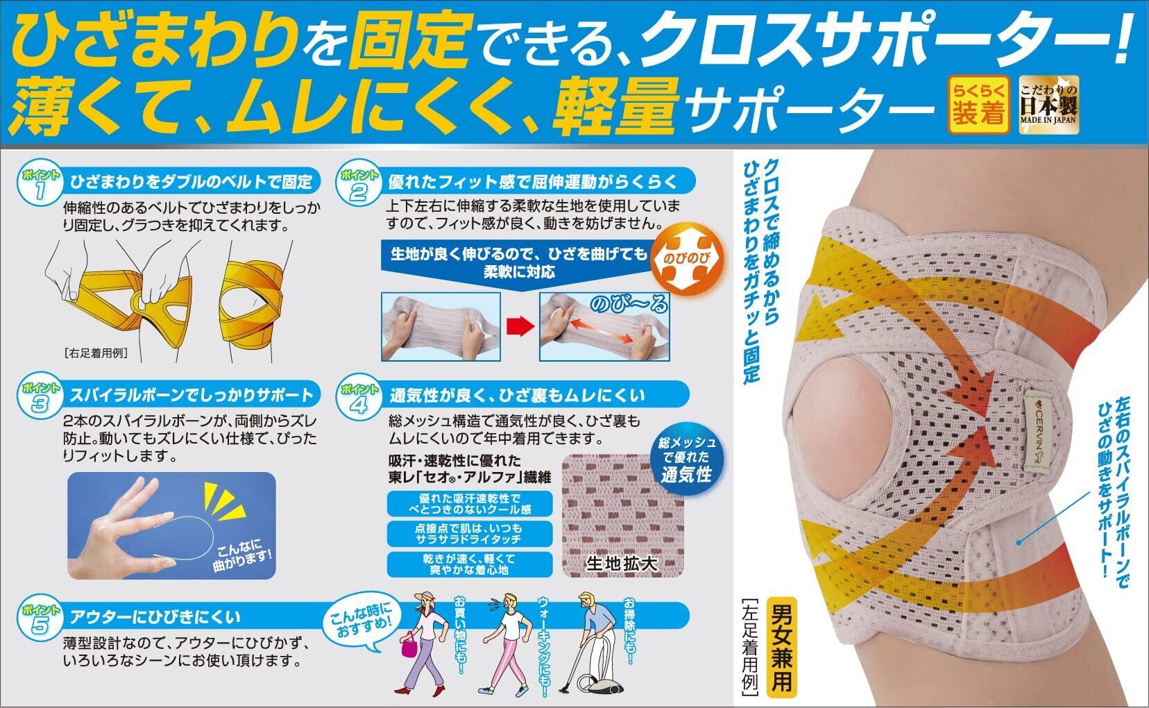 ひざまわりをダブルのベルトで固定する薄くて、蒸れにくい、軽量サポーター。