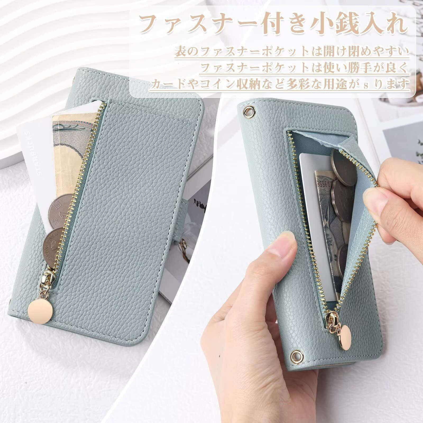 【収納スペース&スタンド機能】1.カード入は内側にあるだけではなく、ケースの表にもファスナーポケット1つ付きます。駐車券や名刺、お札、コインなどを収納でき、L型デザインは薄くて、物の収納ももっと便利になります。金属製のファスナーは長持ちでき、ゴールドとレザーケースの合わせはおしゃれ。2.スタンド機能:裏面を折り曲げれば横置きのスタンドに変われます。動画を心地良い角度で楽しめます。