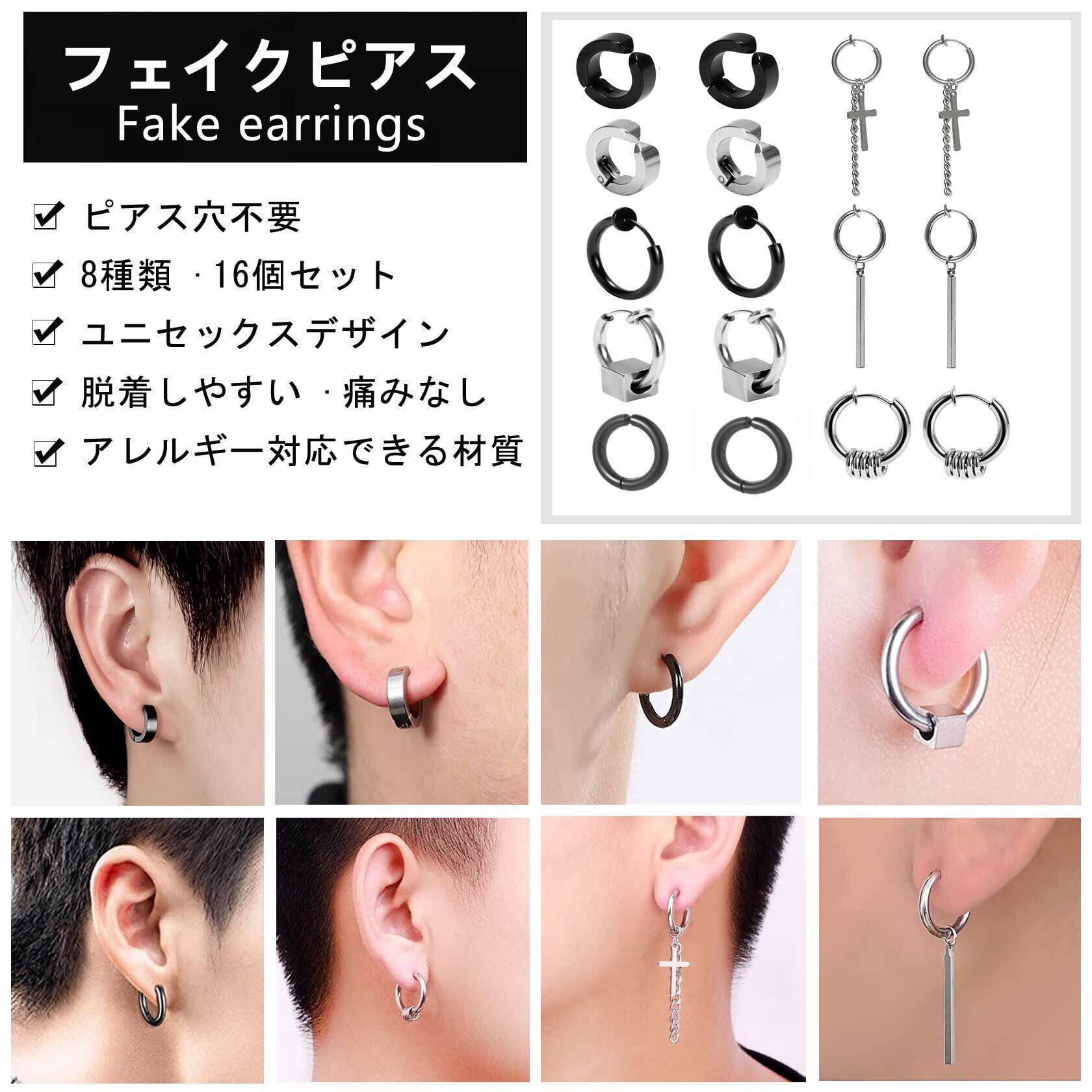 【数量限定】8ペア フェイクピアス メンズ イヤリング イヤーカフ メンズノンホールピアス メンズ レディース フープピアス めんず 人気 リング ピアス 男性 女性 両耳用 片耳 サージカルステンレス316L 金属アレルギー対応 シルバー ブラック 8ペア16個セット earrings for men 収納ポーチ付き ユニセックス | わくわくSHOP