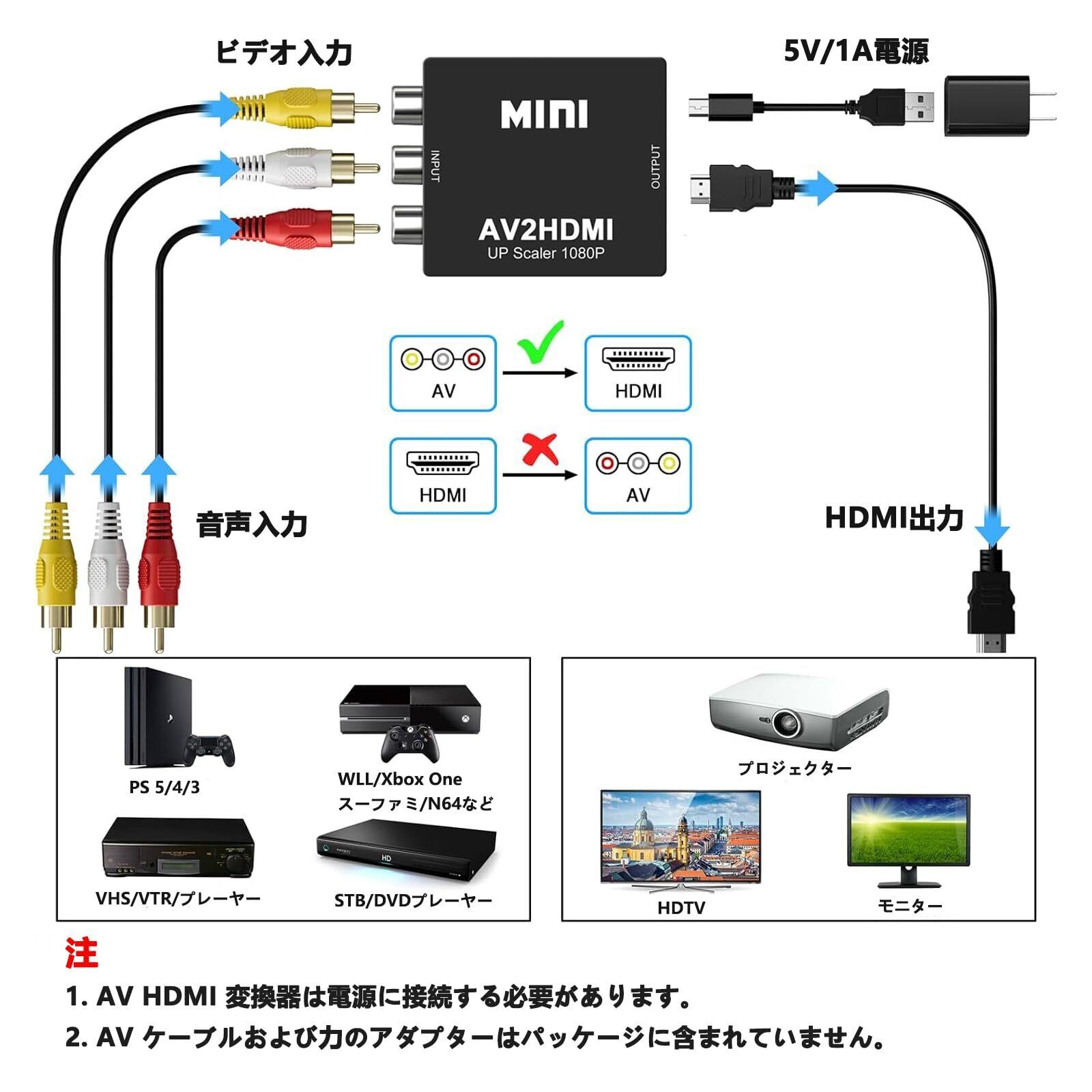 AV to HDMI:本機はアナログであるコンポジットビデオ信号をデジタルであるフルハイビジョンHDMI信号 に変換するコンバーターです。逆方向(HDMI to AV)にはご使用できません。