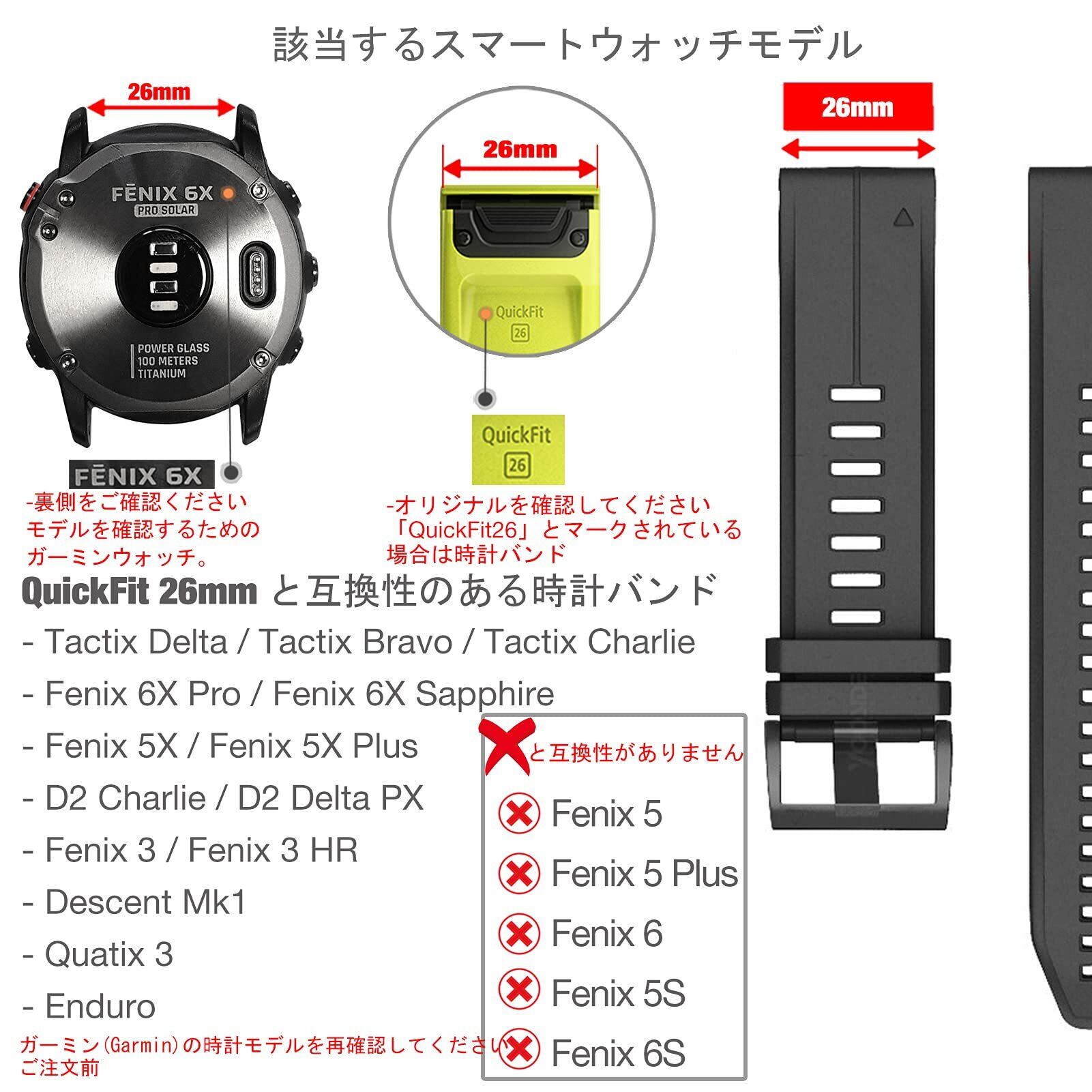 【対応機種】Garminスマートウォッチの背面にマークされているモデルを確認してください。QuickFit 26mmストラップはQuickFit 26mmストラップは、 Fenix 7X Sapphire Solar / Fenix 7X Solar, Enduro / Enduro 2, Tactix 7 Pro, Fenix 6X Pro/Fenix 6X Sapphire、 Fenix 5X /Fenix 5X Plus、Tactix Delta/Tactix Charlie/Tactix Bravo、Quatix 3、Fenix 3 / Fenix 3 HR,D2 Charlie / D2 Delta PX,Descent Mk2i / Descent Mk2 / Descent Mk1