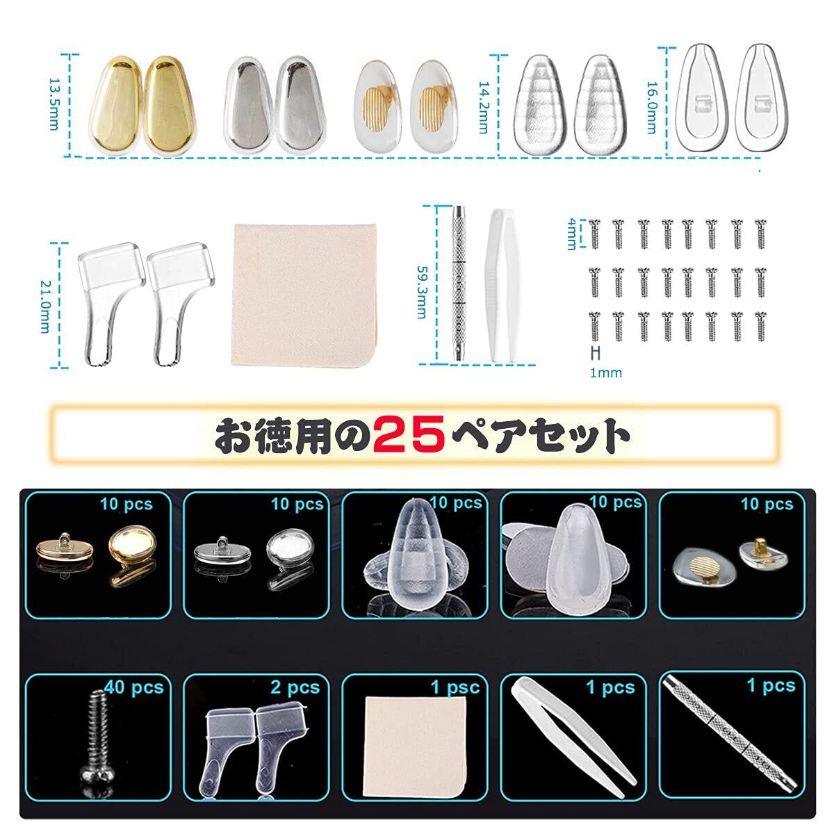 メガネ鼻パッド 眼鏡 鼻パッド メガネ シリコン 柔らかい 25ペア 5種類 ノーズパッド ずれ落ち防止 メガネ用 鼻あて 修理キット エアクッション ハード 金属 交換セット パッド跡軽減 ドライバー ネジ クロス ピンセット ケース 付き