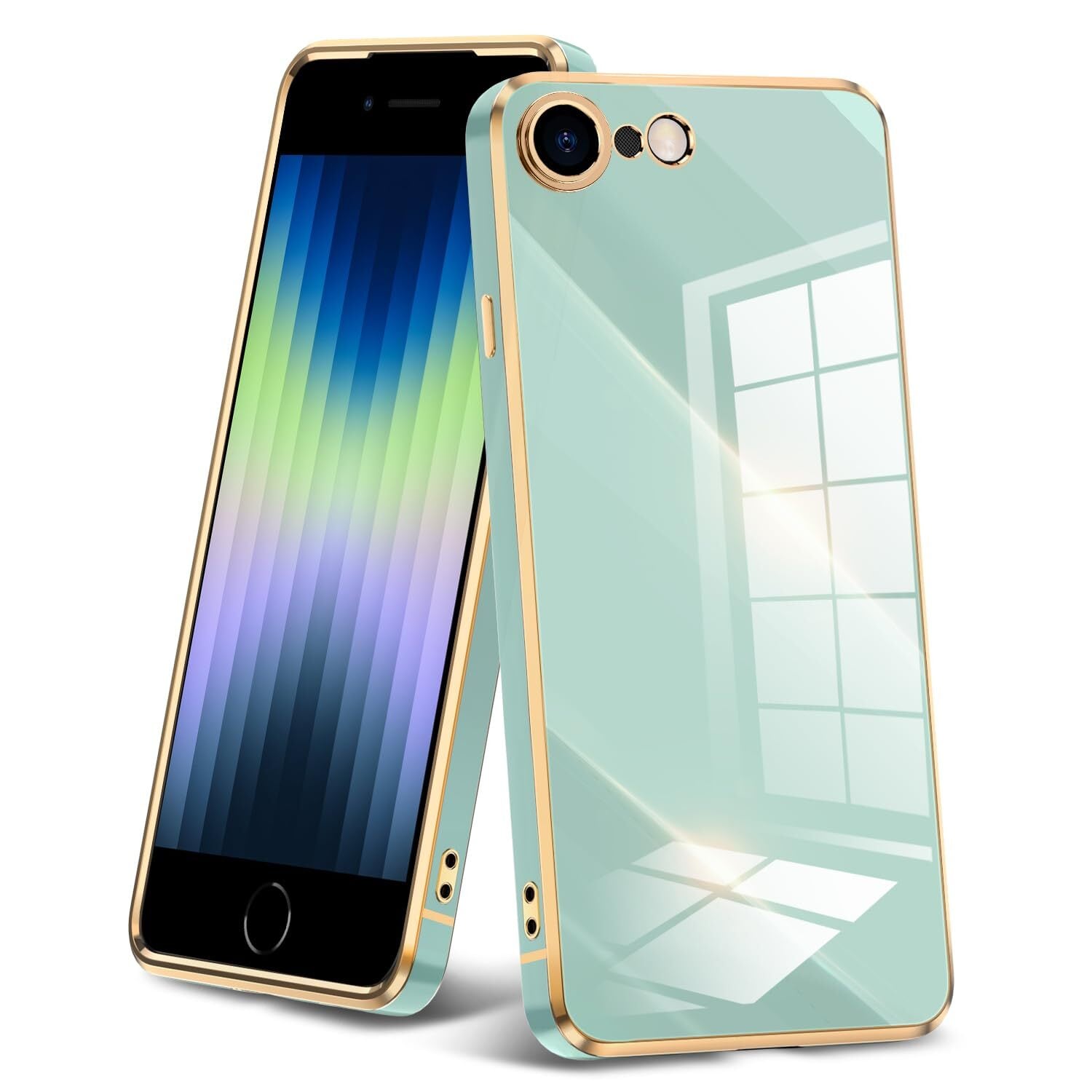 iPhone SE3 ケース iPhone SE ケース 第2世代 iPhone8 ケース iPhone7 ケース クリア 耐衝撃 TPU ケース レンズ保護 ソフトケース 透明 メッキ加工 ワイヤレス充電 アイフォンSE3/SE2/8/7 カバー ストラップホール付き 薄型 軽量 メッキ枠 グリーン/ゴールド JP2-70