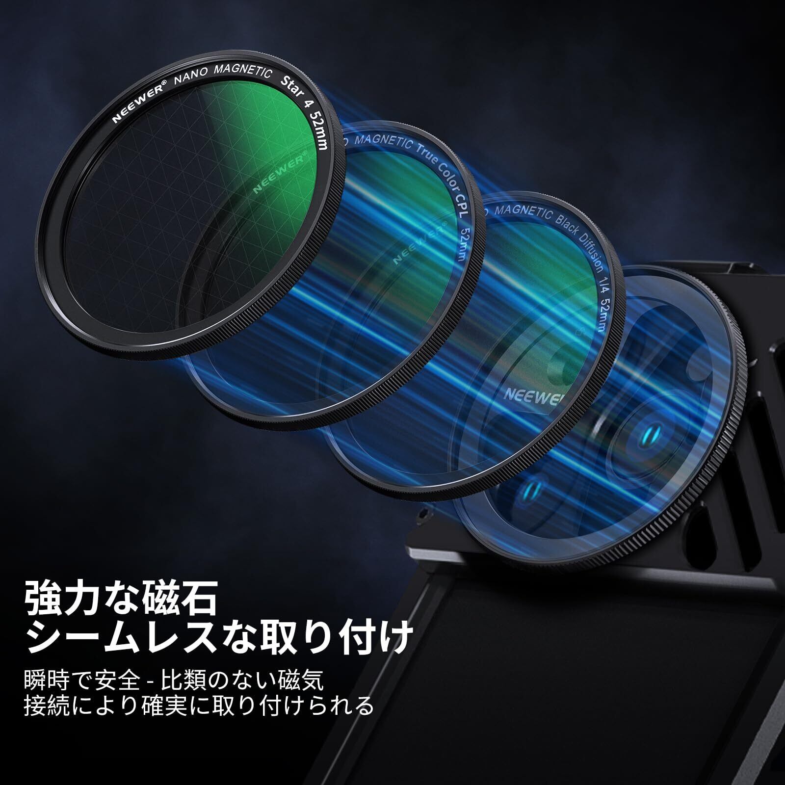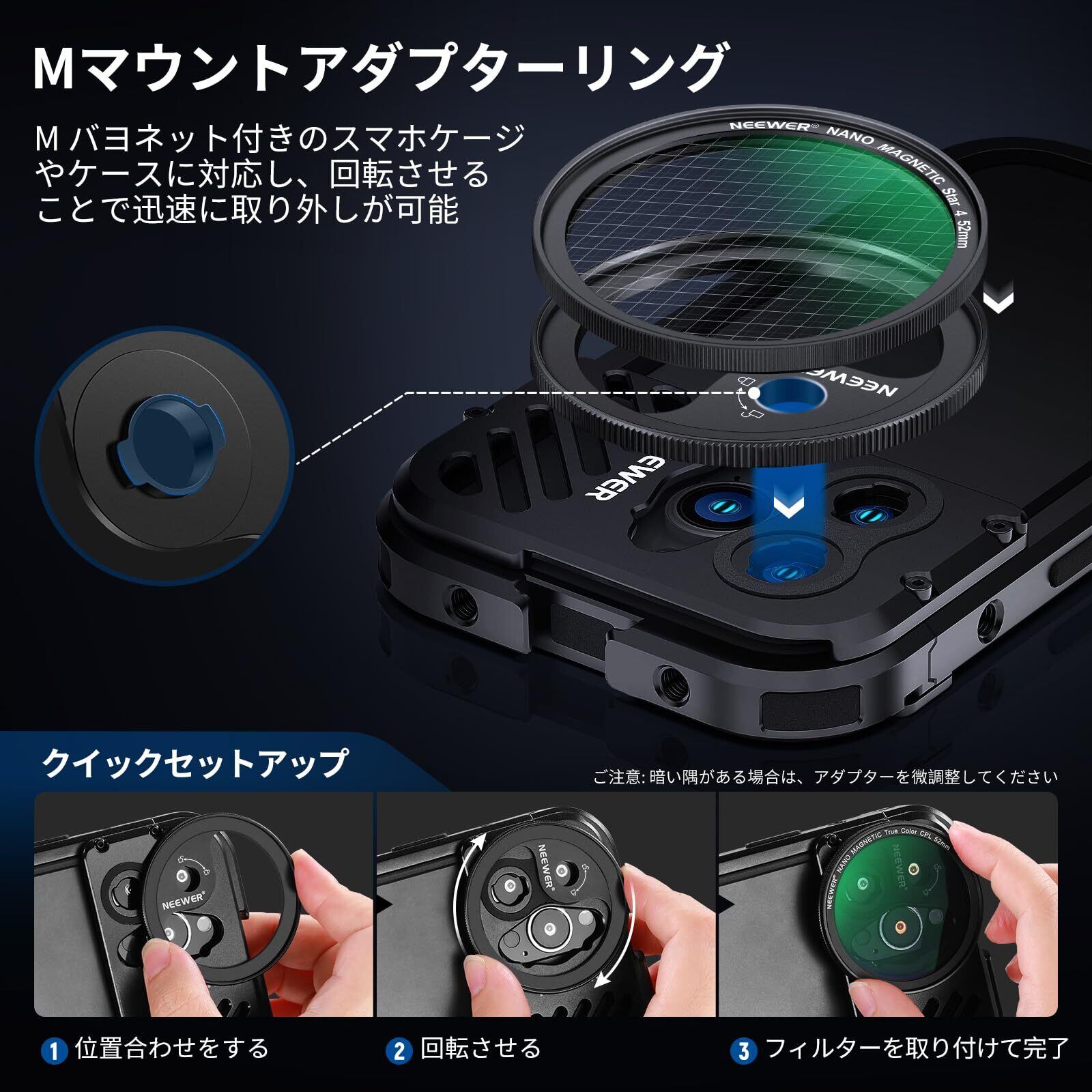 【万能携帯電話レンズ磁気フィルターシステム】NEEWER 52mm磁気レンズフィルターキットは、主に電話レンズ用のMマウントアダプターリングを介して瞬時に安全な磁気アタッチメントを備えており、SmallRigの携帯電話ケースや、iPhone 14 Pro Max (PA011) 14 Pro (PA006) 14 Plus 13 Pro 13 Miniおよび12用のMレンズマウント付きNEEWER電話ケージと互換性があります。 シリーズ。 NEEWER 52mmカメラ磁気フィルターシステムにも対応。