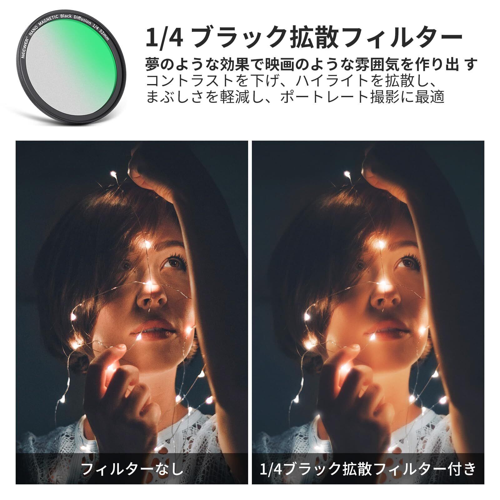 【映画効果のための1/4ブラック拡散フィルター】1/4ストップブラック拡散フィルターは、ハイライトを効果的に減らし、まぶしさを低減し、より滑らかで柔らかい肌のトーンを提供し、ビデオや写真画像に夢のような映画のような効果をもたらします。 携帯電話のレンズを使ってロマンチックな雰囲気を作り出すのに役立ちます。 ポートレート写真、ビデオ録画、ビデオブログに最適です。