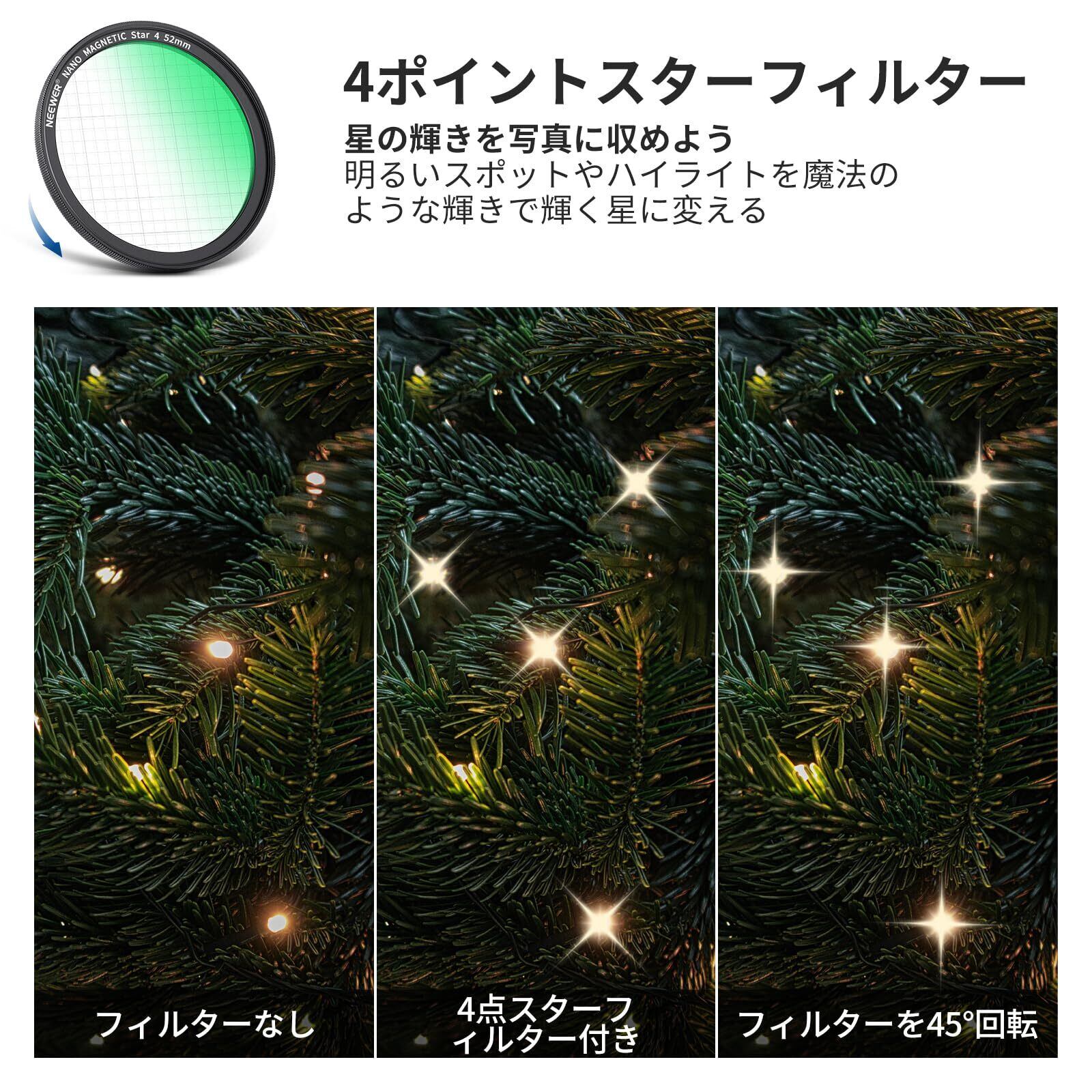 【ショットに星空の素晴らしさ】4ポイントのスターフィルターは、素晴らしいスターバースト効果を生み出し、写真やビデオに魔法のようなタッチを加えます。 魅惑的な夜のシーンを捉えたり、被写体にドラマチックなセンスを加えるのに最適です。 この特殊効果フィルターを使えば、創造性を解き放ち、モバイル写真やビデオ撮影を次のレベルに引き上げることができます。