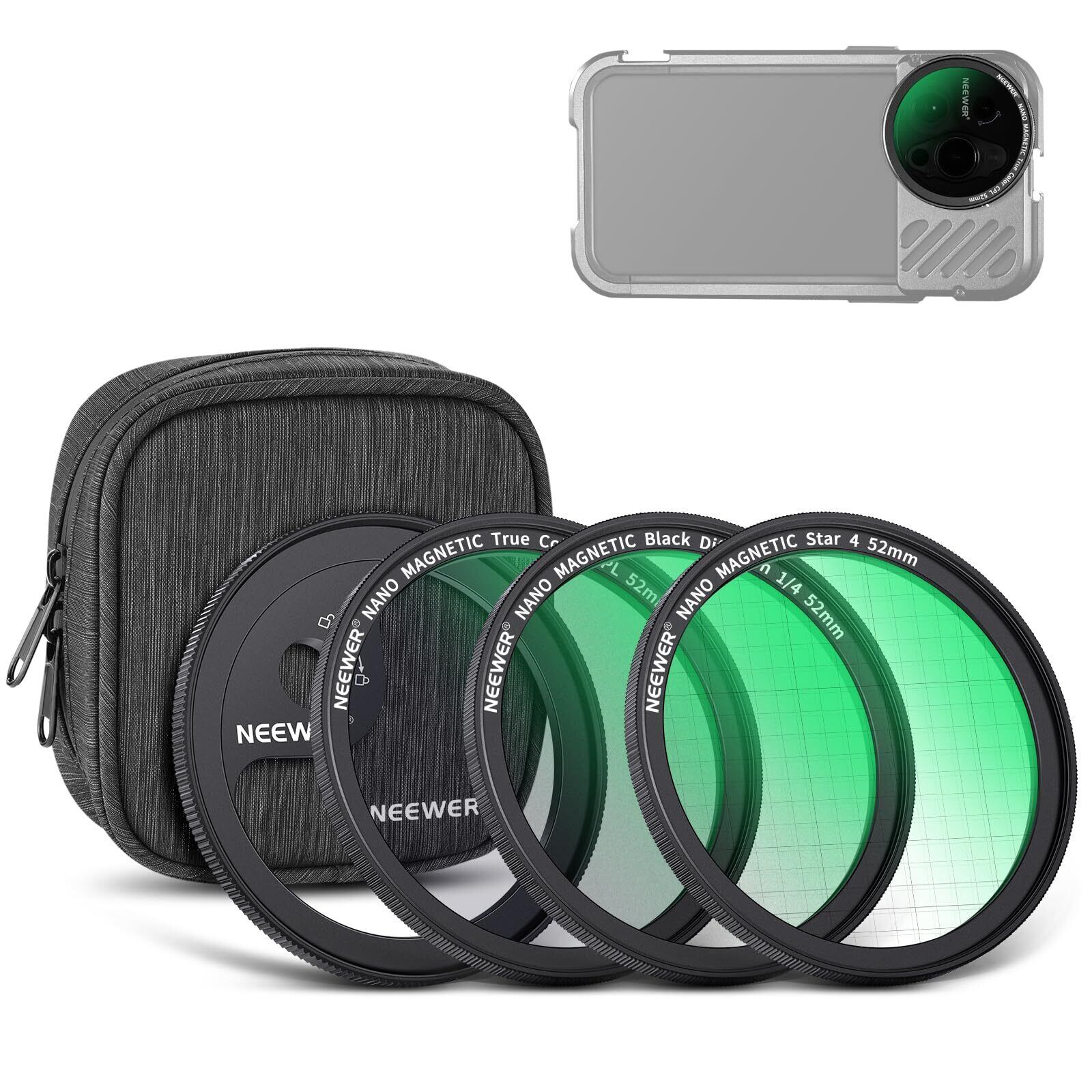 NEEWER 52mm スマホ用マグネットフィルター アダプターリング/4ポイントスター/トゥルーカラーCPL/1/4ブラック拡散フィルター付き SmallRigに対応 NEEWER スマホケージに対応 Mレンズマウント iPhone 14 13 12 シリーズ用