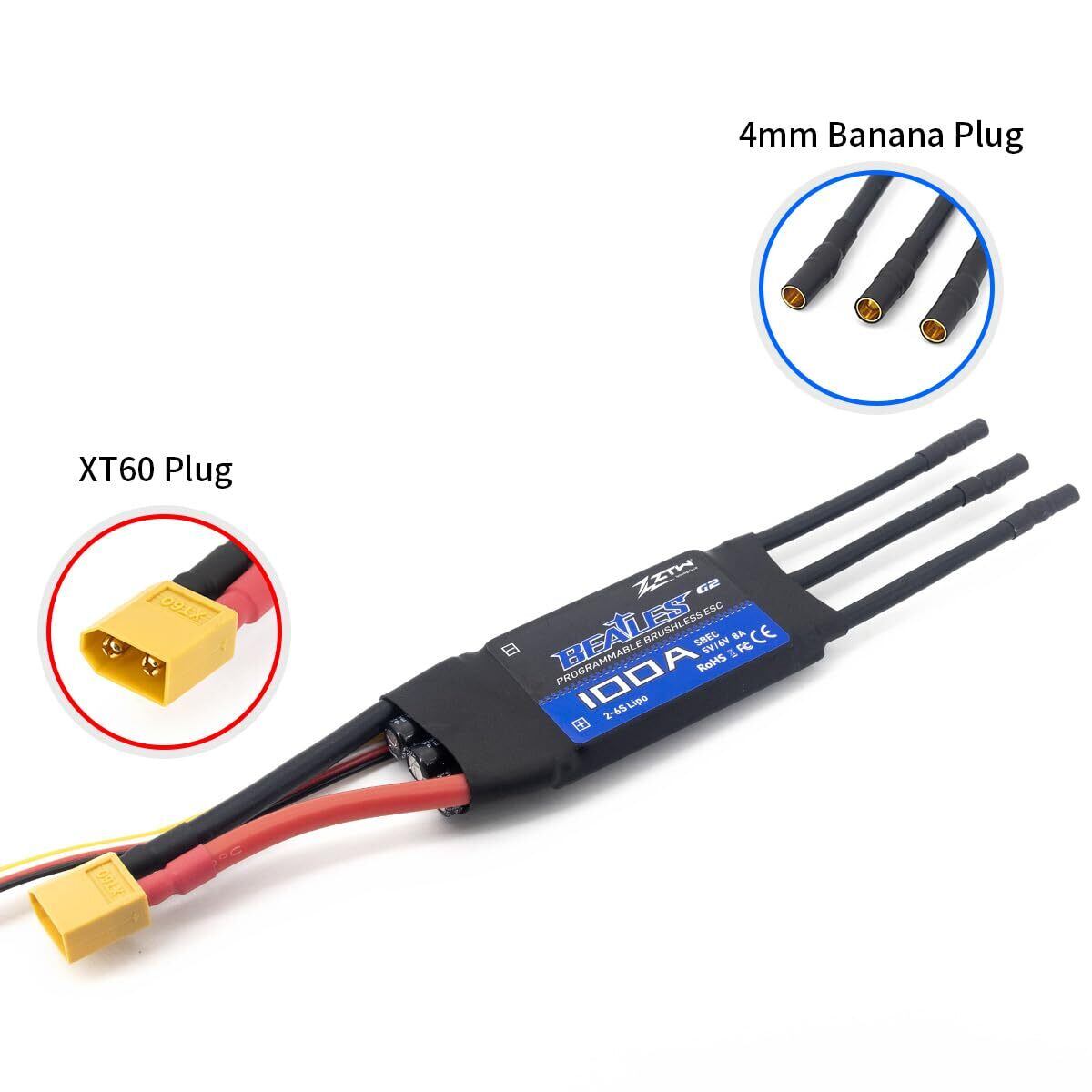 【2022最新】32ビットアンプZTW Beatles G2 ESC 100A内蔵スイッチングBEC 5V/6V 8A 2-6S ブラシレススピードコントローラーRC飛行機3D フライングヘリコプター固定翼空用 (100A G2 ESC with XT60 Plug)