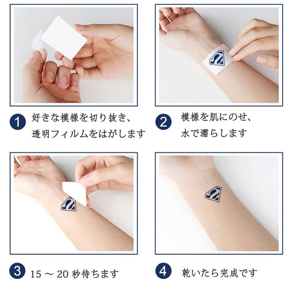 【広く使われています】ハロウィン、音楽フェス、イベント、クラブ、お祭り、パーティー、海水浴 などの場所で使うのに適しています。人の肌だけでなく、スマホケース、携帯電話、ノートパソコン、手芸品など、どんなものでもOK。腕、足、背中、 胸などの好きなところに貼ってください。しわの所、体毛 濃い所、よく動く ところには貼らないようにしてください。