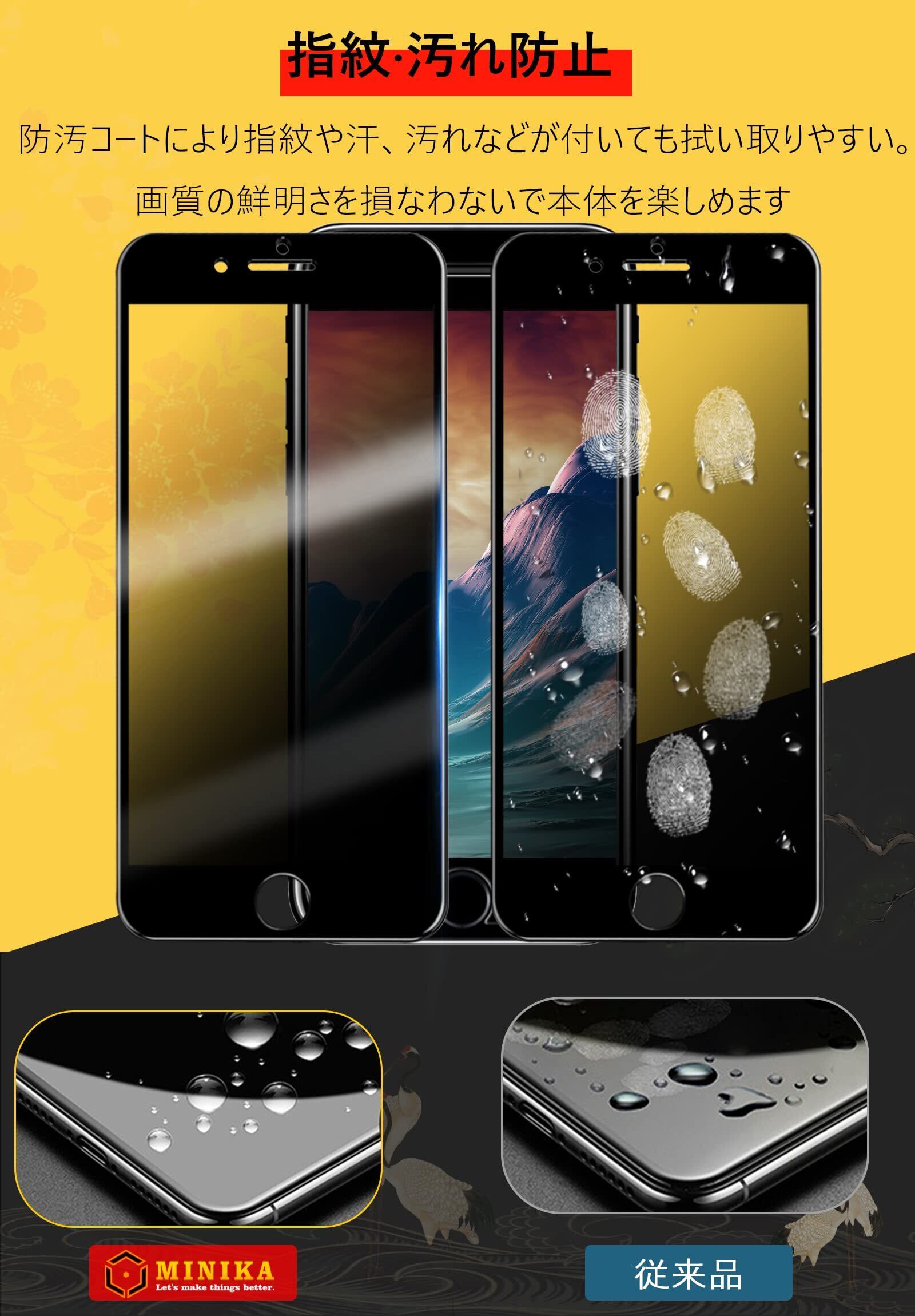 【指紋防止・飛散防止】 MINIKAのiPhone se2 のぞき見防止フィルム 撥油コーティング加工されているため、ホコリや指紋など汚れにくくなっています。付着しても簡単に拭き取れます。画面を美しいままに保つ、スムーズな操作が可能です。ガラスフィルムは飛散防止加工されておりますので、万が一割れの場合でも、飛び散らず張り付いた安全の状態になります。