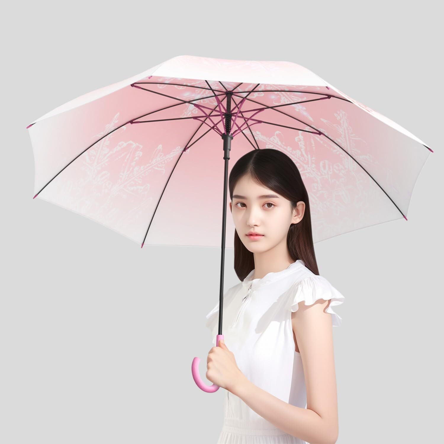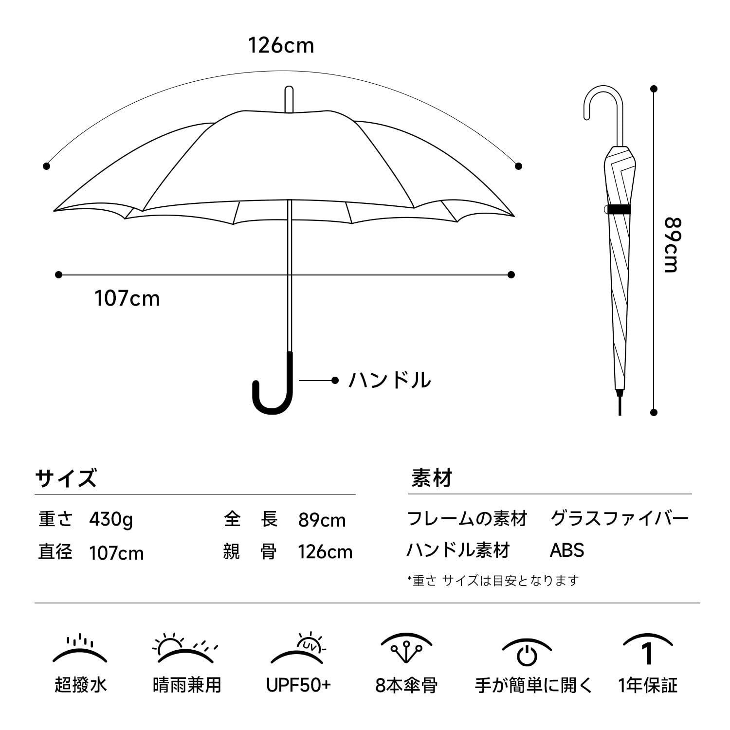 「軽量·耐風」傘骨は全体で高強度グラスファイバーで作られて、軽量、頑丈、耐久性などの特徴を持ちます。重さは約450gで、長時間で持ちの腕の辛さを減らして、使用、携帯ともはとても便利です。グラスファイバーが耐強風、錆止め、折りにくいです。暴風雨の日も安心に使えます。