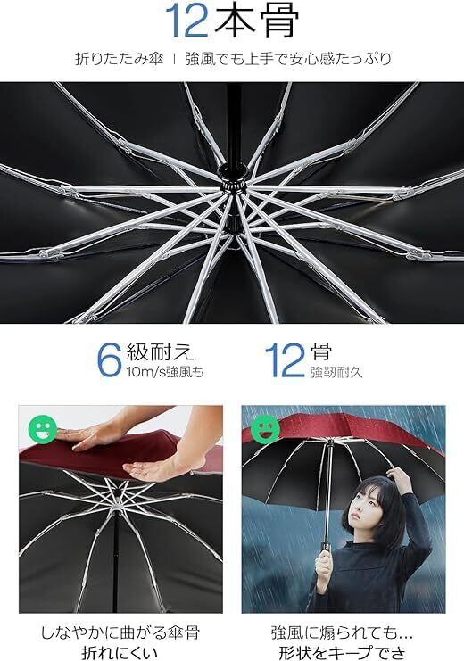 新設計の12本骨構造 - 超大12本骨の折りたたみ傘で、強風や台風にも負けない頑丈さ。長持ちする設計で、安心してご使用いただけます。