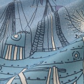 出航間近の船をながめるムーミンたち。新しい冒険の旅を心待ちにしているのかもしれません。