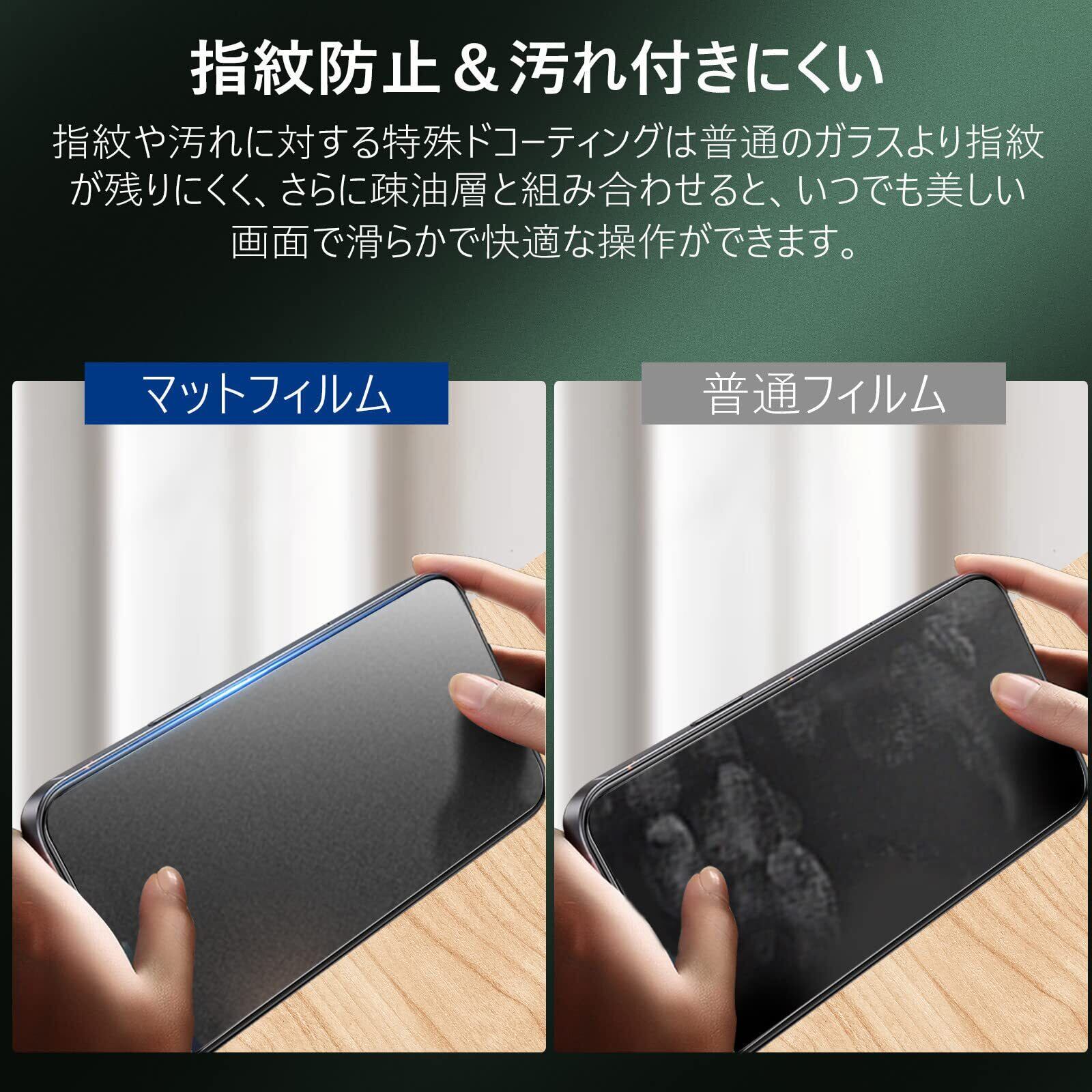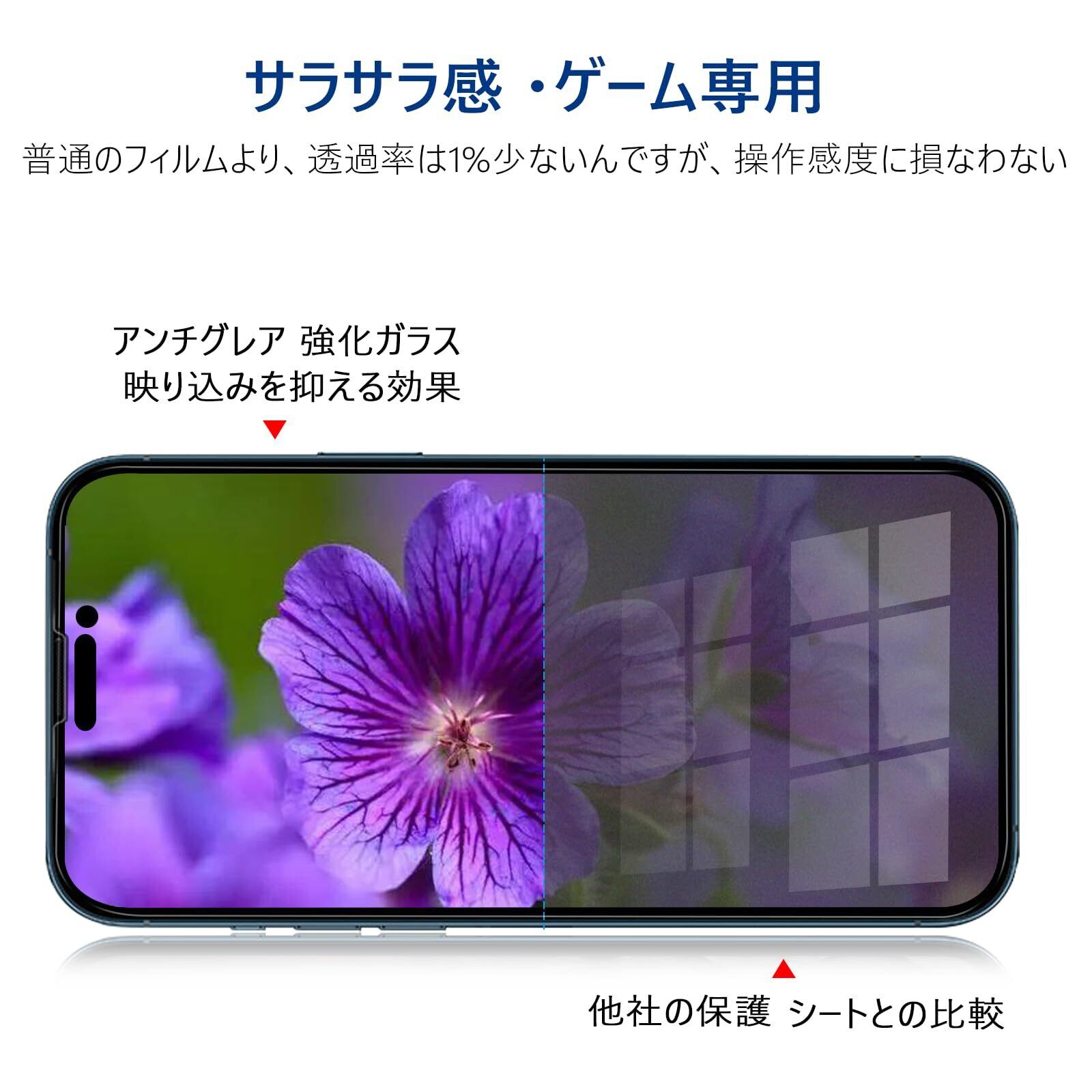 【アンチグレア/つや消し】:iPhone14promax アンチグレアがらすフィルムは、映り込み防止処理で蛍光灯や太陽光の反射が下がります。サラサラとした指触りで、化粧品や皮脂などが付きにくくゲーム向きです。