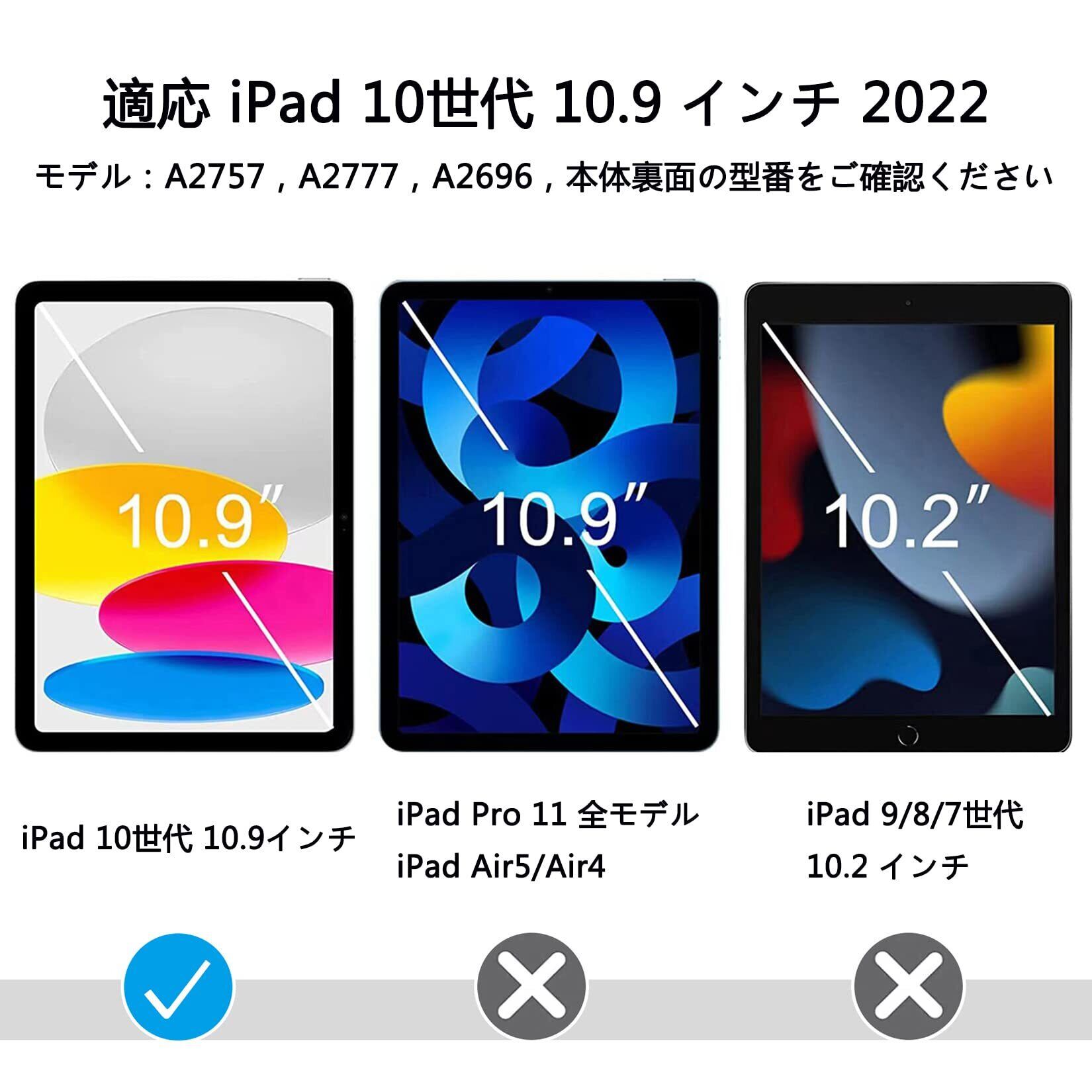 【対応機種】iPad 10世代 ガラスフィルム 2022 10.9 インチ 。対応モデル:A2757/A2777/A2696。本体裏面の型番をご確認ください。