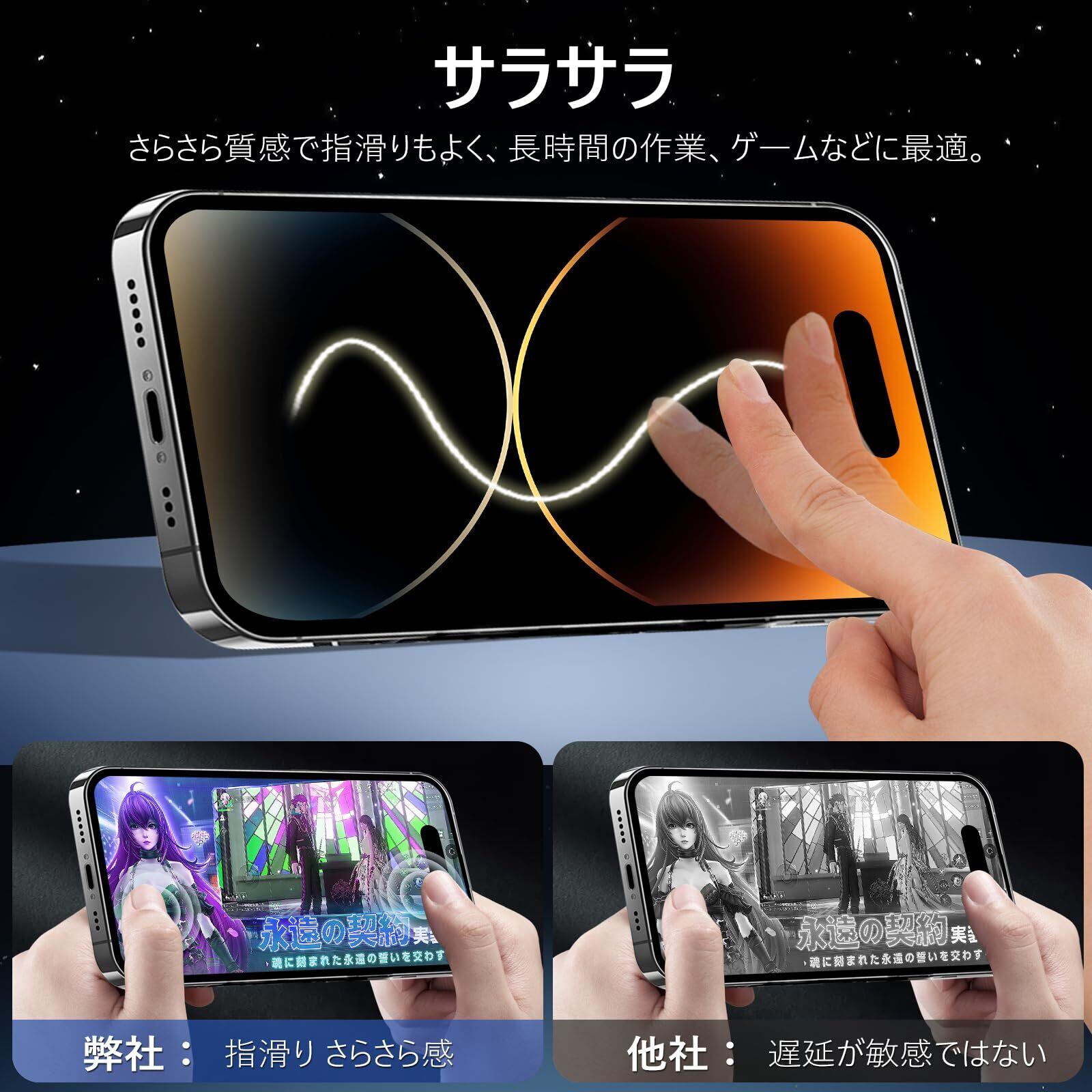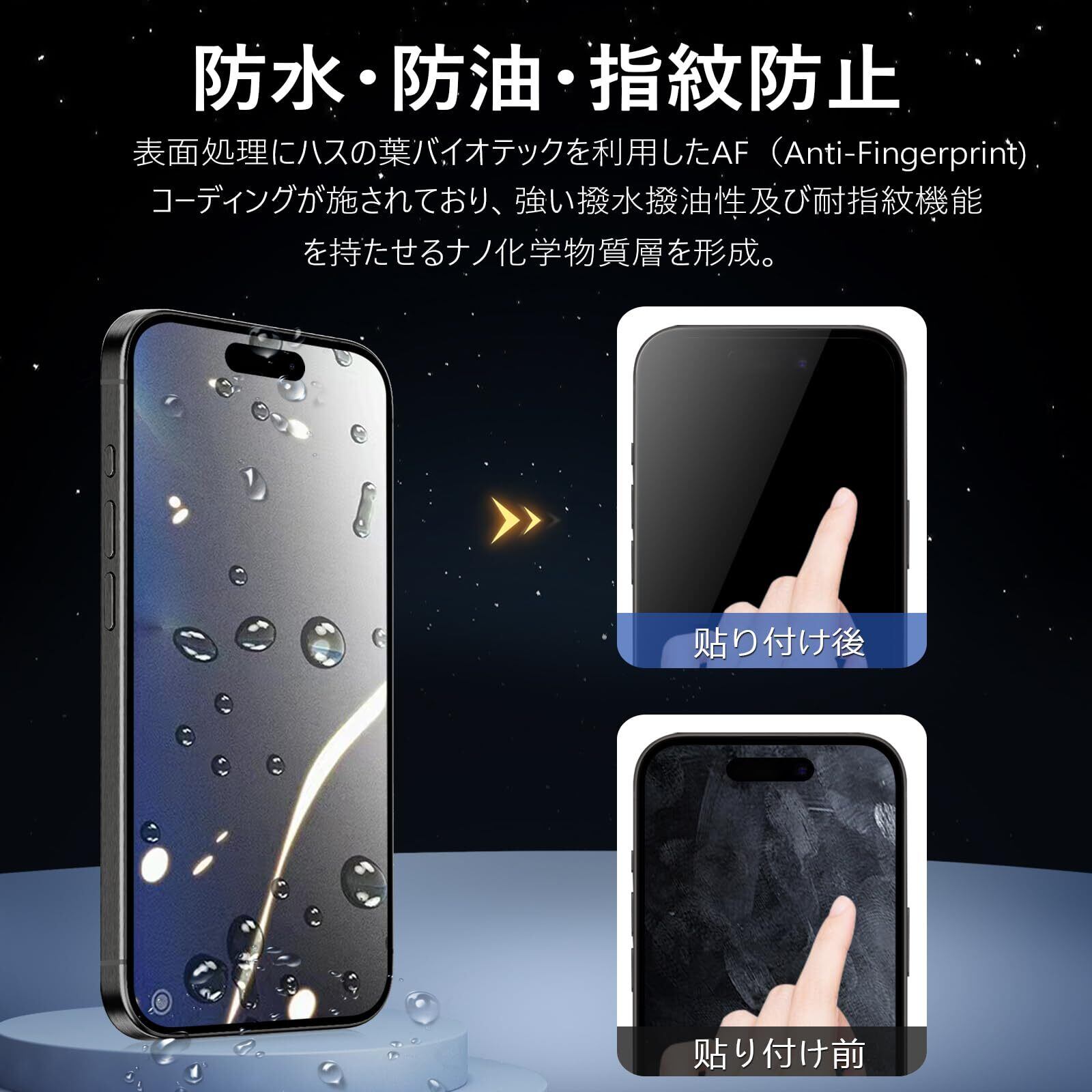 【アンチグレア・指紋防止・高感度タッチ】 アンチグレア(非光沢)タイプのさらさらで快適な操作感。光の反射を軽減し、より目に優しくちらつきを抑えます。同時に、iPhone14プロガラスフィルムには撥油コーティングが施されており、指紋や汚れなどに強くなめらかな操作感を実現、付着した汚れなどは簡単に拭きとれます。こちらは高耐久撥油コーティングが施され、つるつるな滑り感を実現!ゲームをする人におすすめです。