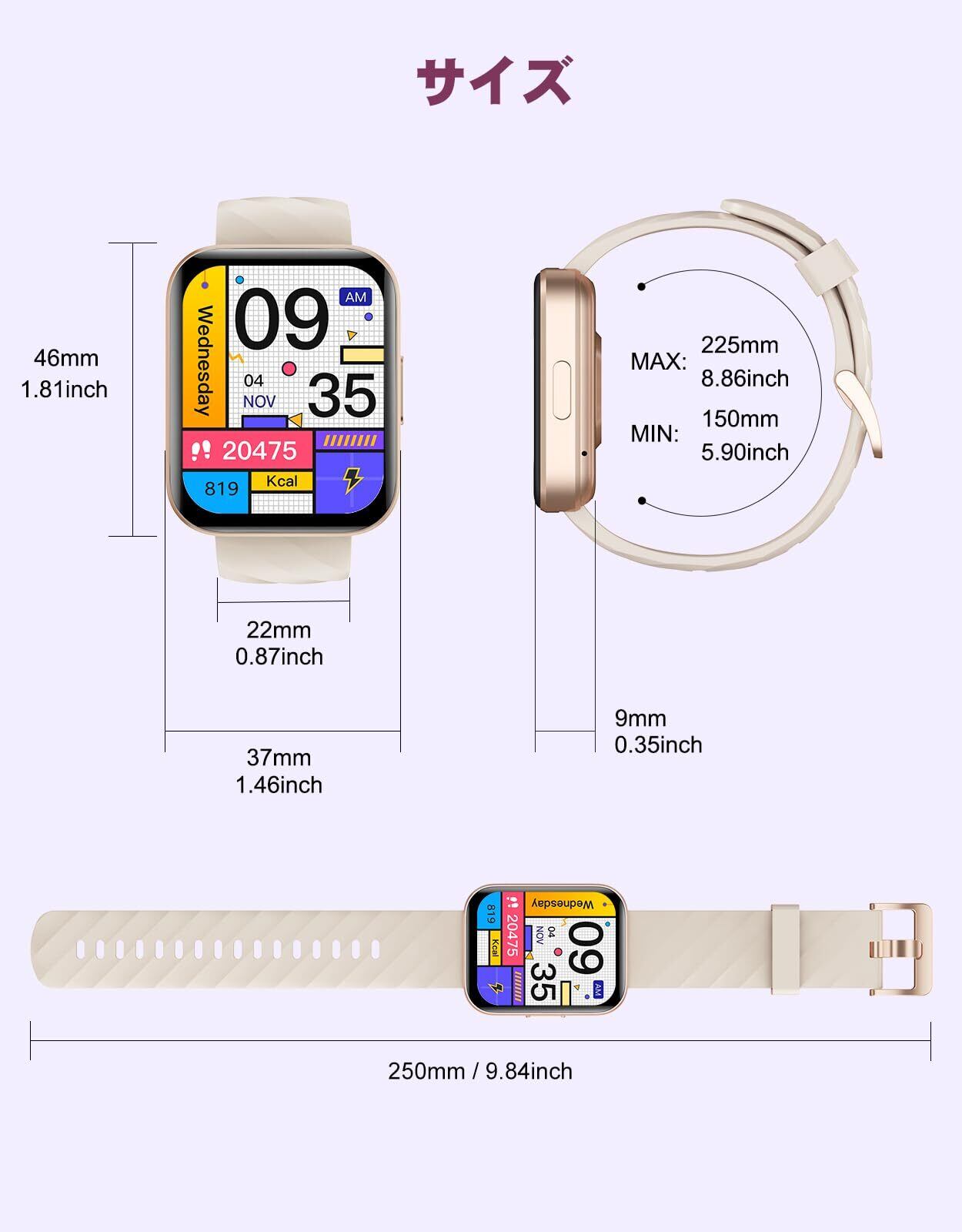 【大容量バッテリー&便利な機能満載】長い持ちのバッテリー搭載され、一回フル充電、3~5日間の連続使用も問題なく、待機時間は約30日間です。頻繁に充電する手間が省けます。付属の磁気充電ケーブルをスマートウォッチの充電端子に接続すると充電開始となります(実際の使用状況や環境によって電量持ち時間が異なります)通知やBluebooth通話などの基本的なスマートウォッチ機能に加え、例えば、音声アシスタント、おやすみモード、携帯検索、天気予報、懐中電灯、電卓、ゲーム、目覚まし時計、ストップウォッチ、SOSなど、日常生活をより快適にする機能が搭載されています。また遠隔操作もお任せください。ios9.0以上、android5.0以上のスマホに対応可能、さまざまシーンで使用できます!レディースでも、メンズでも、幅広い方にお使いいただけます。敬老の日、誕生日、父の日、母の日、新年、 クリスマスなどに適用なプレゼントとなります。