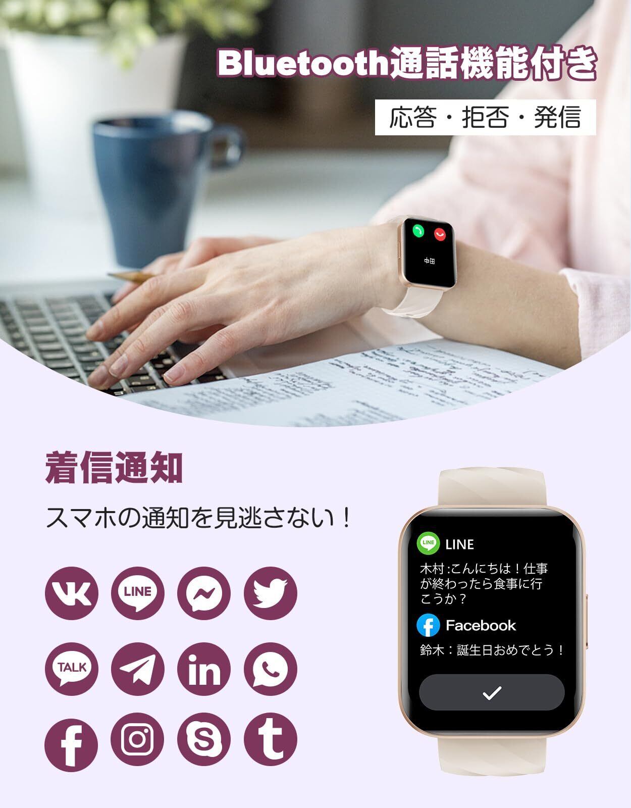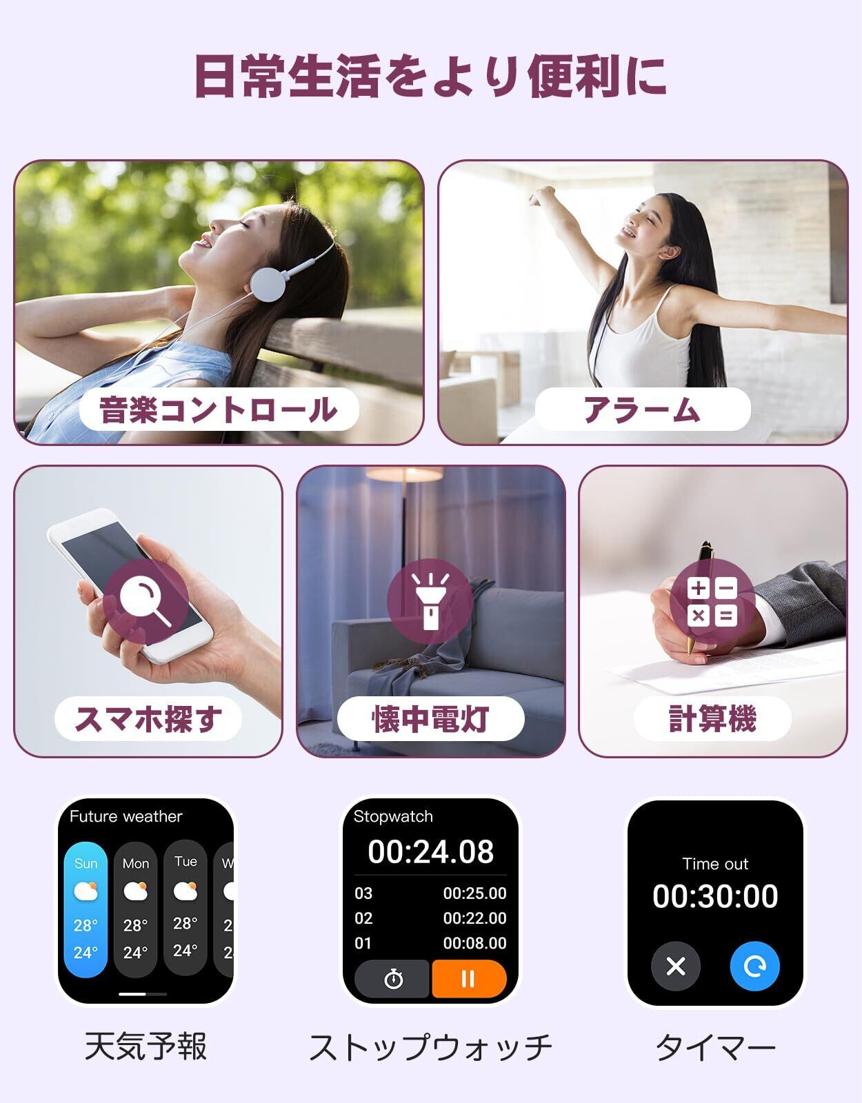 【活動量計&日常生活管理&IP68級の防水】日常生活や様々なスポーツ、フィットネス活動において、スマートウォッチの革新モデルは歩数、距離など様々なスポーツデータを記録することができます。ランニング、ウォーキング、サッカー、水泳、ヨガなど、アプリには100種類以上の運動モードがあり、多様な運動ニーズに応え、運動管理をサポートします!スマートウォッチは手首に装着することができ、軽量設計と通気性の良いベルドにより、一日中装着していても負担なく身体の状態を把握することができます。、女性のニーズに合わせて生理周期の機能も搭載しています。日常生活に大きな利便性をもたらし、幸福感をもたらす!IP68の防水性を備えているので、日常生活の手洗いや洗顔の際はもちろん、夏に汗だくのトレーニングにも気にせずに使用OK です。※ご注意:お風呂、サウナ、温泉水や温泉の湯気及び高い水圧は故障の原因となります。
