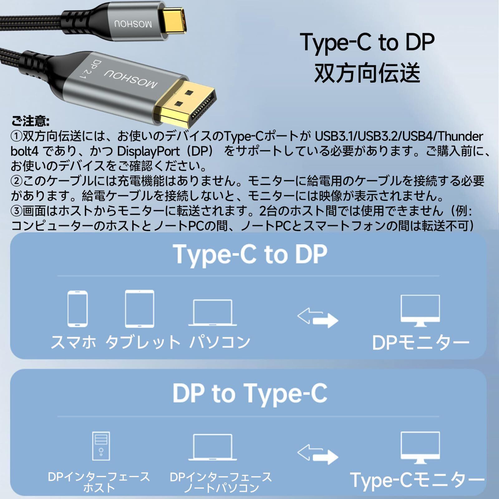 【Type-C to DP 2.1ケーブル&双方向伝送】これはType-C to DP 2.1ケーブルで、双方向伝送が可能です。スマホやタブレット、パソコンなどからDPモニターへの送信を実現し、DPインターフェースホストやDPインターフェースノートパソコンからType-Cモニターへの伝送もできます。