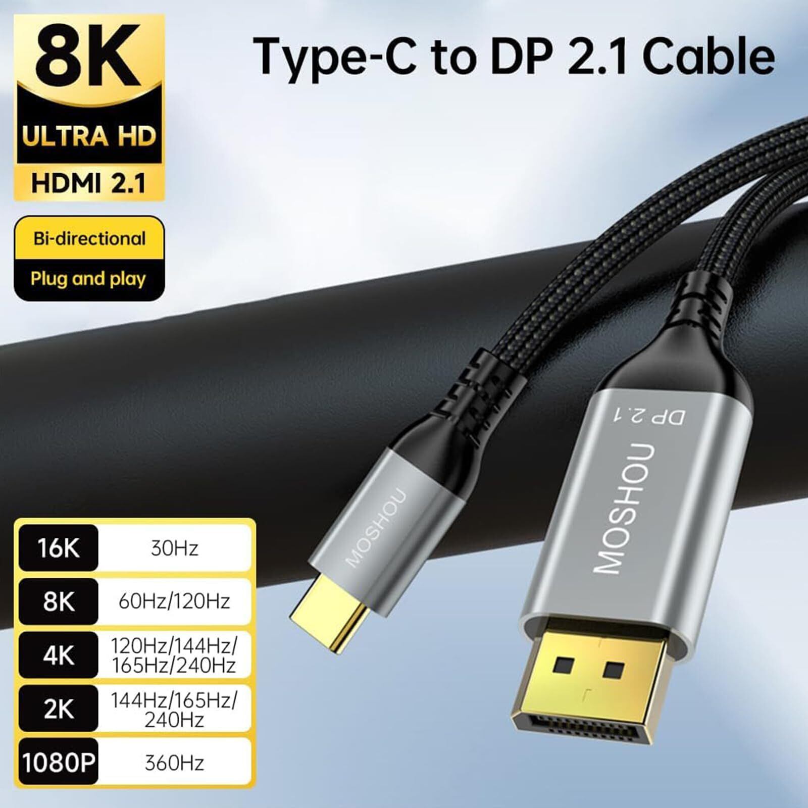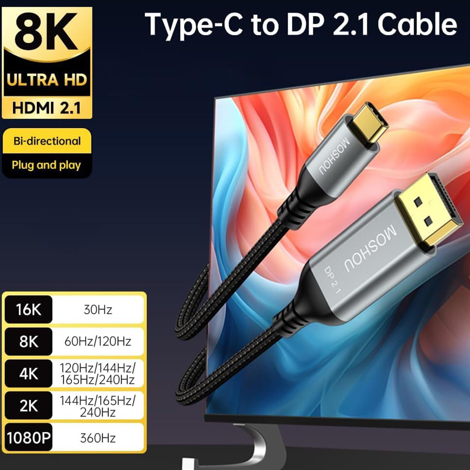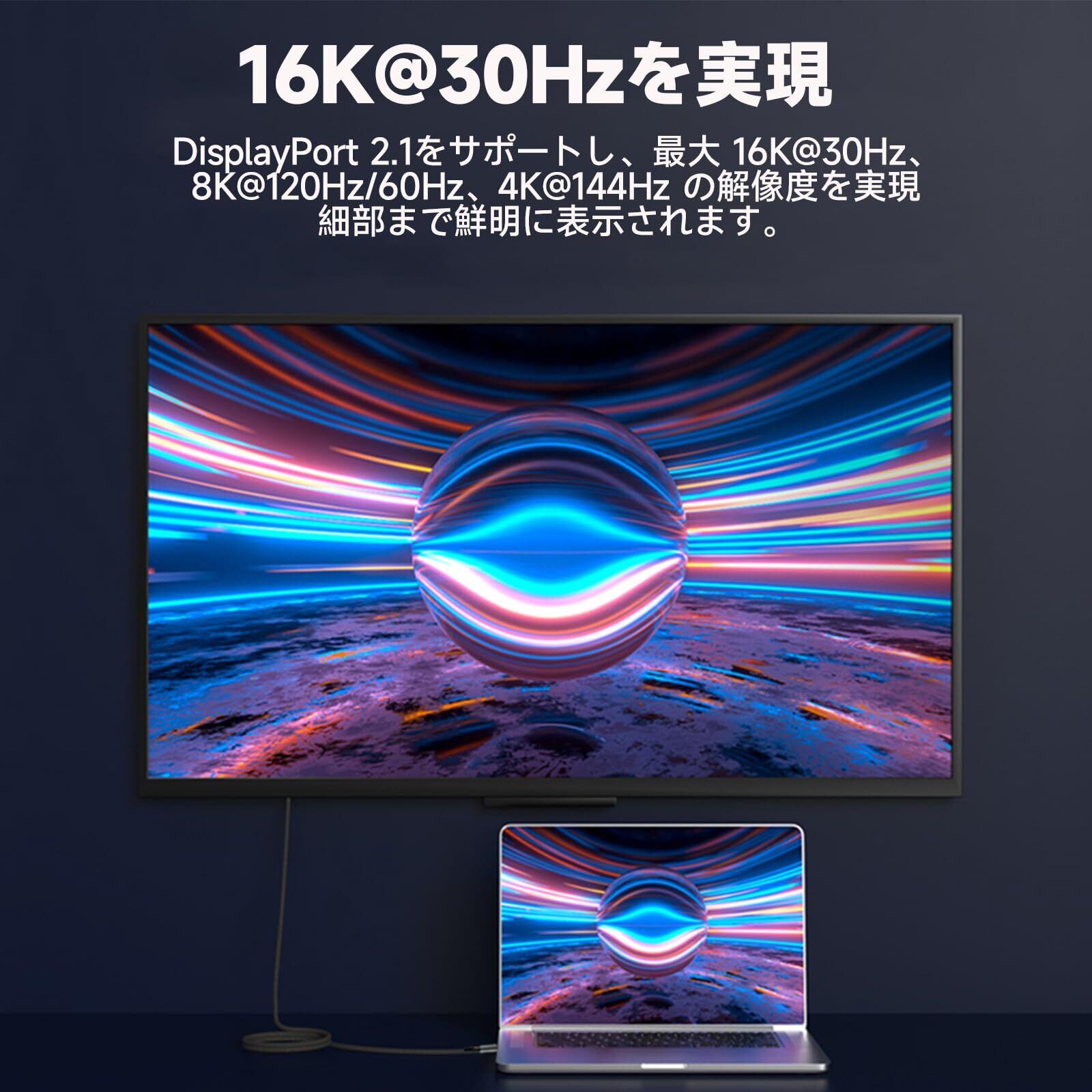 【DisplayPort 2.1をサポート&Max16Kハイビジョンを実現】DPケーブルはDisplayPort 2.1を支持し、大幅に高い解像度とリフレッシュレートをサポートします。16K@30Hz,8K@60Hz/120Hz,4K@120Hz/144Hz/165Hz/240Hz,2K@144Hz/165Hz/240Hz,1080P@360Hzという出力に対応しています。リフレッシュレートはMax240Hzになります。(実際の解像度とリフレッシュレート はデバイスに関係します。)