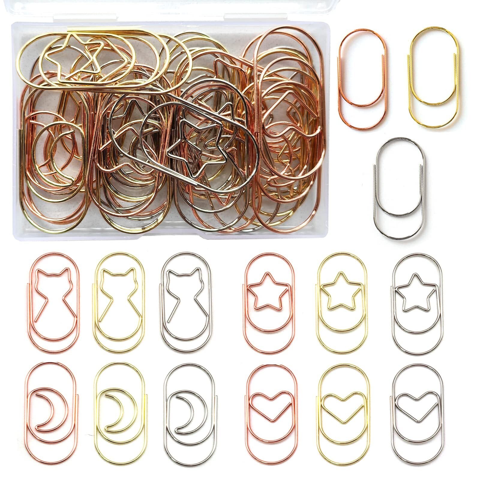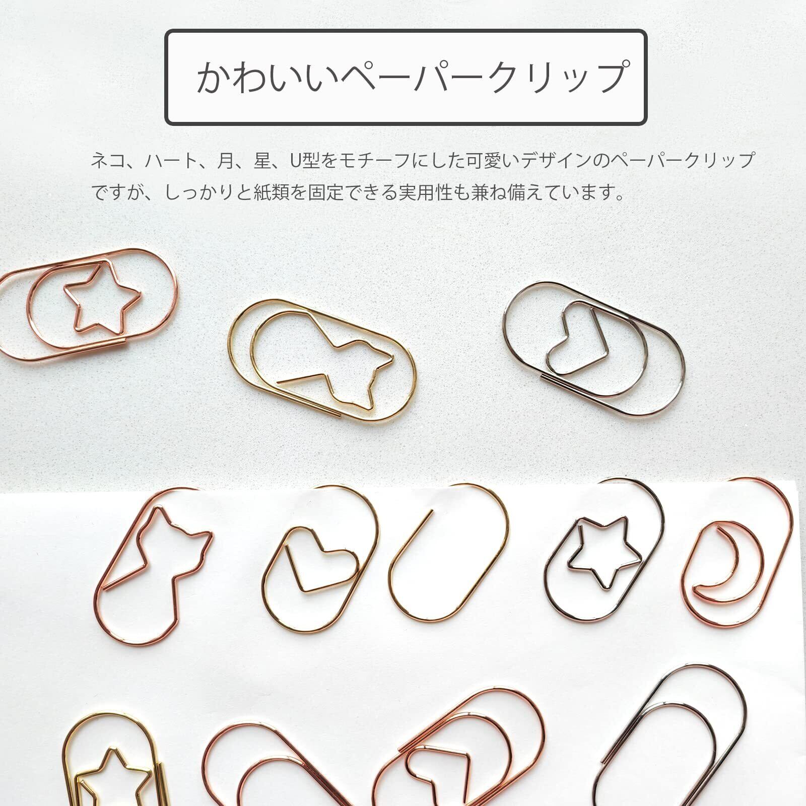 【製品仕様】●セット内容:ゼムクリップ30個入り(5種類3色各2個)、収納ケース付き;●5種類:猫、ハート、月、星、U型;●サイズ:約50*25mm、線径:約1.2mm;●重量:約2.1g/個、約1.6g/個(U型);●素材:炭素鋼線+電気メッキ;●色:ゴールド、ピンクゴールド、シルバー