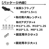 【パッケージ】延長シフトノブM10*1.5×1、取付アダプタ×4(M12*1.25、M10*1.25、M10*1.5、M8*1.25) 、固定用ネジ小×3、固定用ネジ大×1、取付用六角レンチ×1