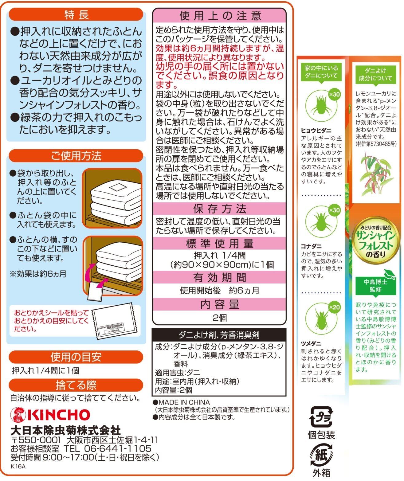 虫コナーズ KINCHO 押入れ・収納にダニコナーズ ダニよけシート 2個入 サンシャインフォレストの香り
