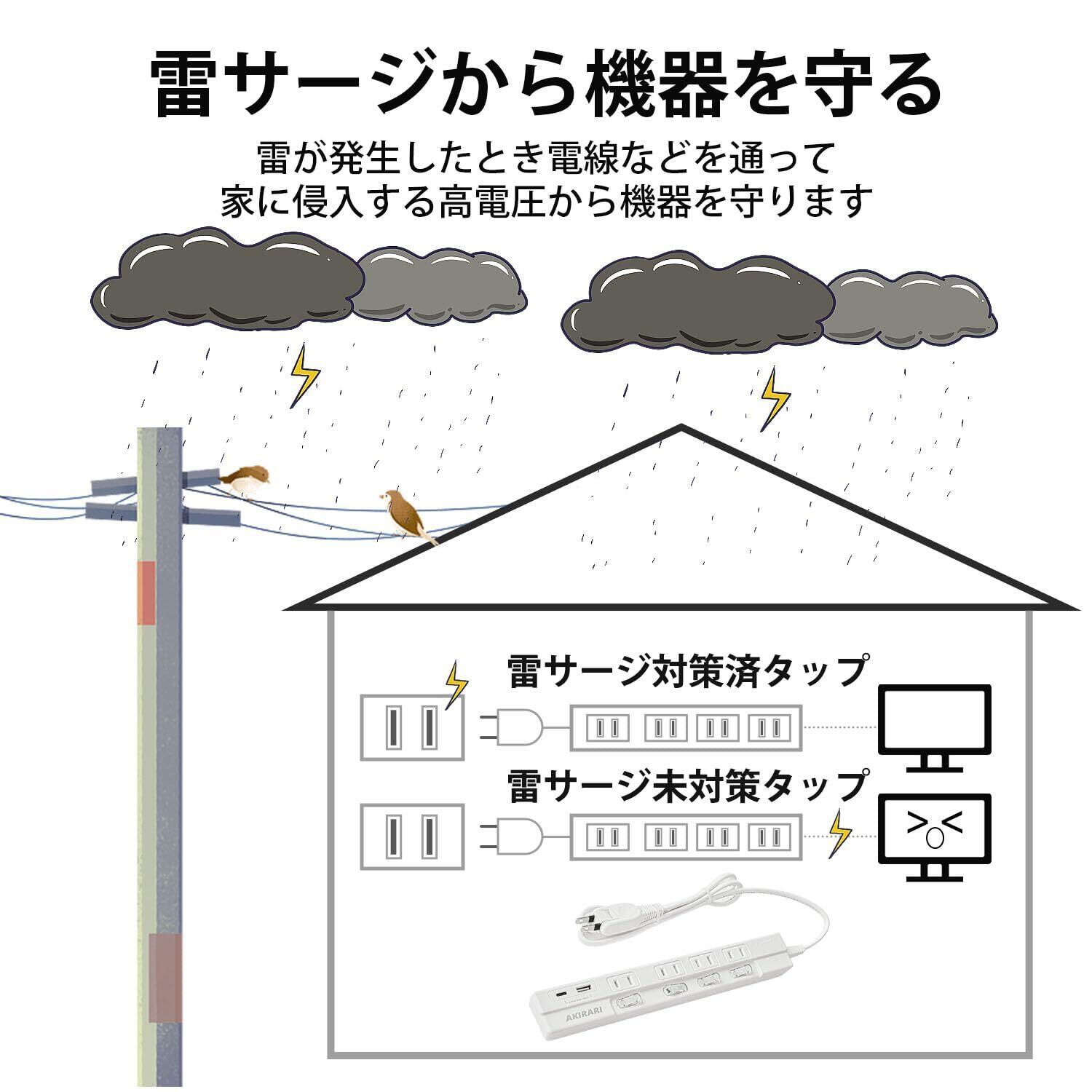 【雷ガード搭載 電源タップ】内蔵されたサージ吸収素子(バリスタ)が雷サージを吸収し、接続機器を守ります。雷ガード搭載の電源タップは、家庭やオフィスの電気設備の安全性を向上させます。 雷ガード機能により、電気系統への異常な電圧や電流の侵入を防ぐことで、火災や感電のリスクを低減します。パソコンやテレビなどの精密機器を雷から守る。高性能雷サージ吸収素子内蔵、安全性と使い勝手に配慮した雷ガードタップ。