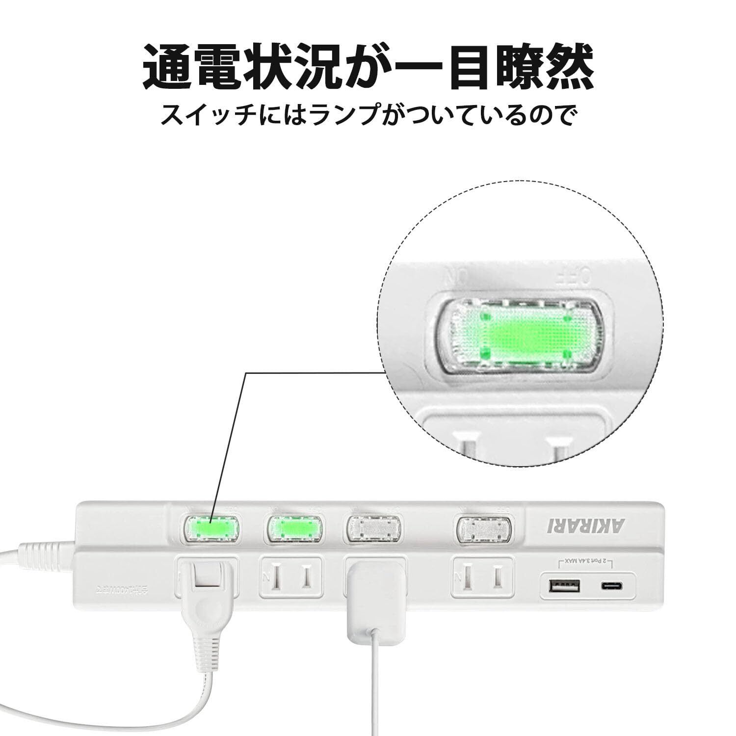 【個別スイッチ付き 電源タップ】ACコンセント部は個別スイッチを搭載。コンセントを抜き差しすることなく、電源をこまめにON・OFFできます。 また、待機電力もカットでき、節電にも効果があります。個別スイッチが付いている電源タップでは、各差込口に接続された機器の電源を個別にオン/オフできます。 これにより、必要なときに特定の機器の電源を切ったり、まとめてオン/オフすることができます。例えば、使用しない機器の電源を切ることで、節電効果が期待できます。