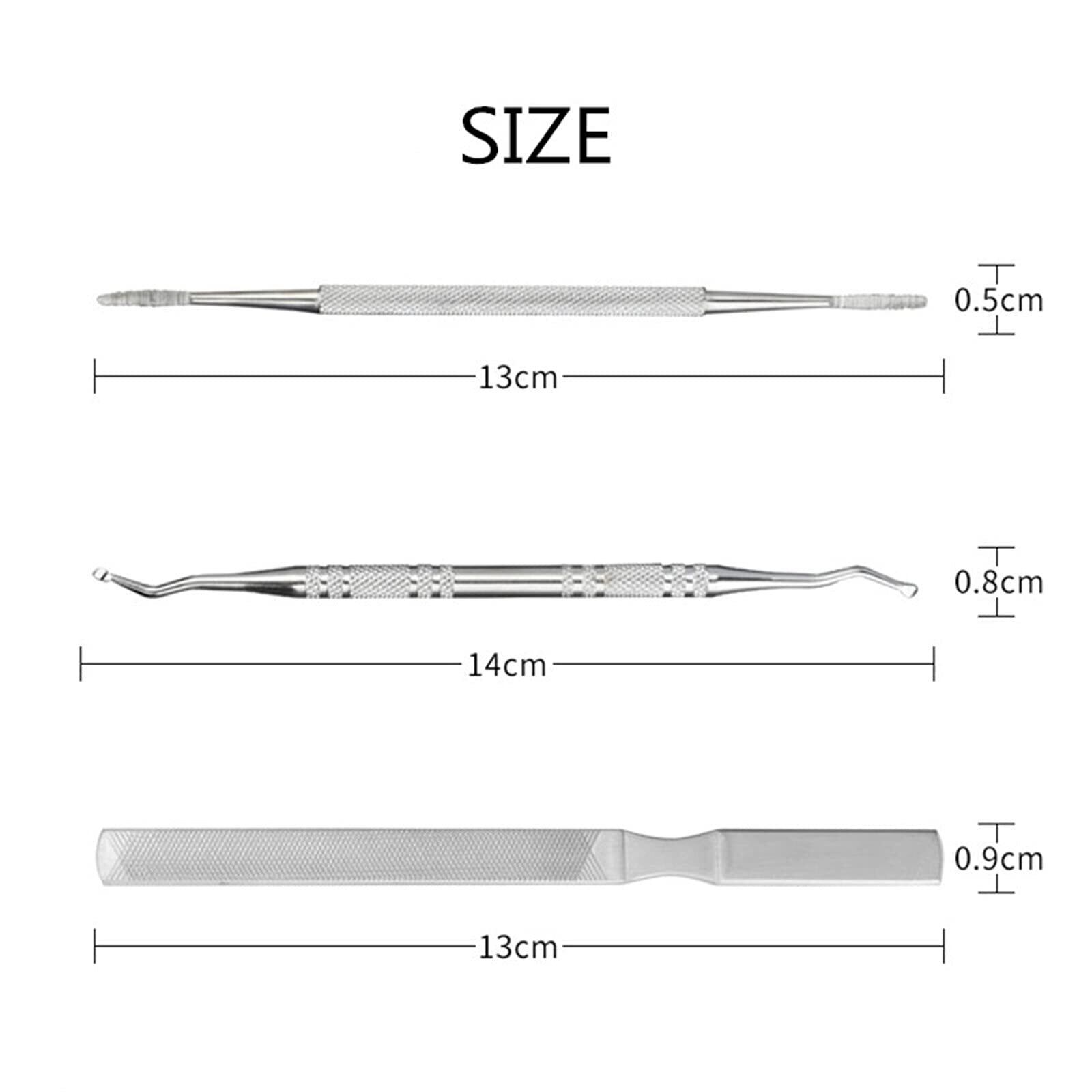材質:ステンレス鋼 サイズ:画像をご参照ください。 爪やすり、爪垢取り、両端爪やすりの3本セットです。足の爪のお手入れに便利です。ステンレス製なので清潔で耐久性に優れます。使用後洗浄しやすい。 爪垢取りで爪の垢やゴミを簡単に取り除けます。爪やすりを使って爪の角を丸くしたり、爪の形を整えたりすることができます。 パッケージ:3本入り ケース入りなので収納に便利です。