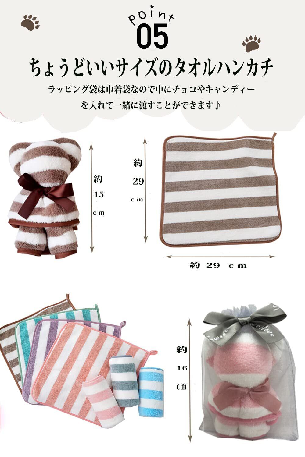 5個セット 5カラー×1 10個セット 5カラー×2 8個セット 4カラー×2 クマの形で広げるとハンドタオルになり かわいいのに実用的で大変喜ばれます! 退職、退院のお礼、粗品、プチギフト、ホワイトデー、結婚式のお礼の品として女性に人気です。 ハンドタオル(ハンカチ)のギフトですので男女問わず喜ばれます。 個包装してるためそのまま渡すことができます。