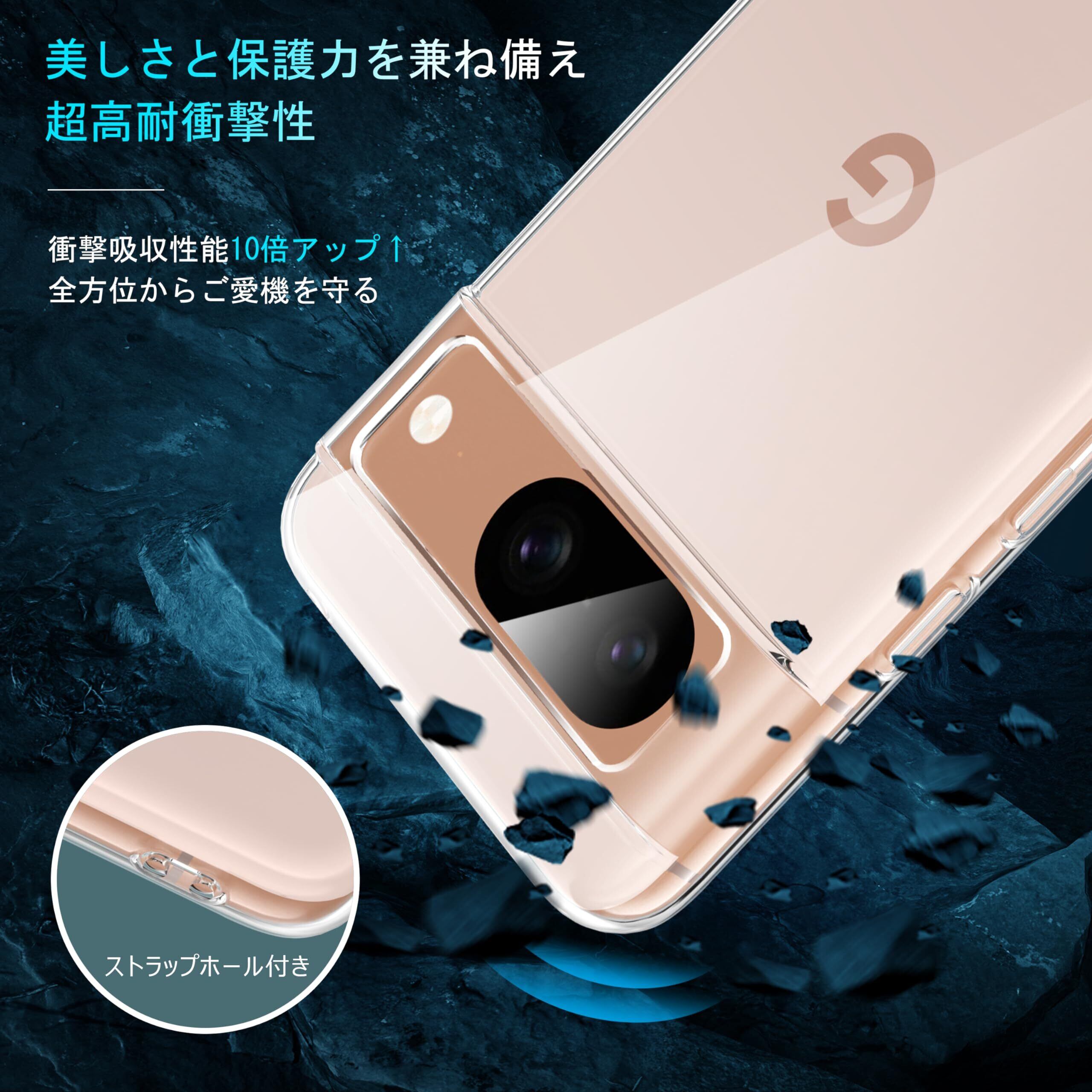 Google Pixel 8 用 ケース クリア 薄型 ドイツバイエル製TPU素材 超耐衝撃 全透明 黄変防止 レンズ保護 指紋防止 「ストラップホール付き」 ピクセル8 用カバー クリスタル・クリア