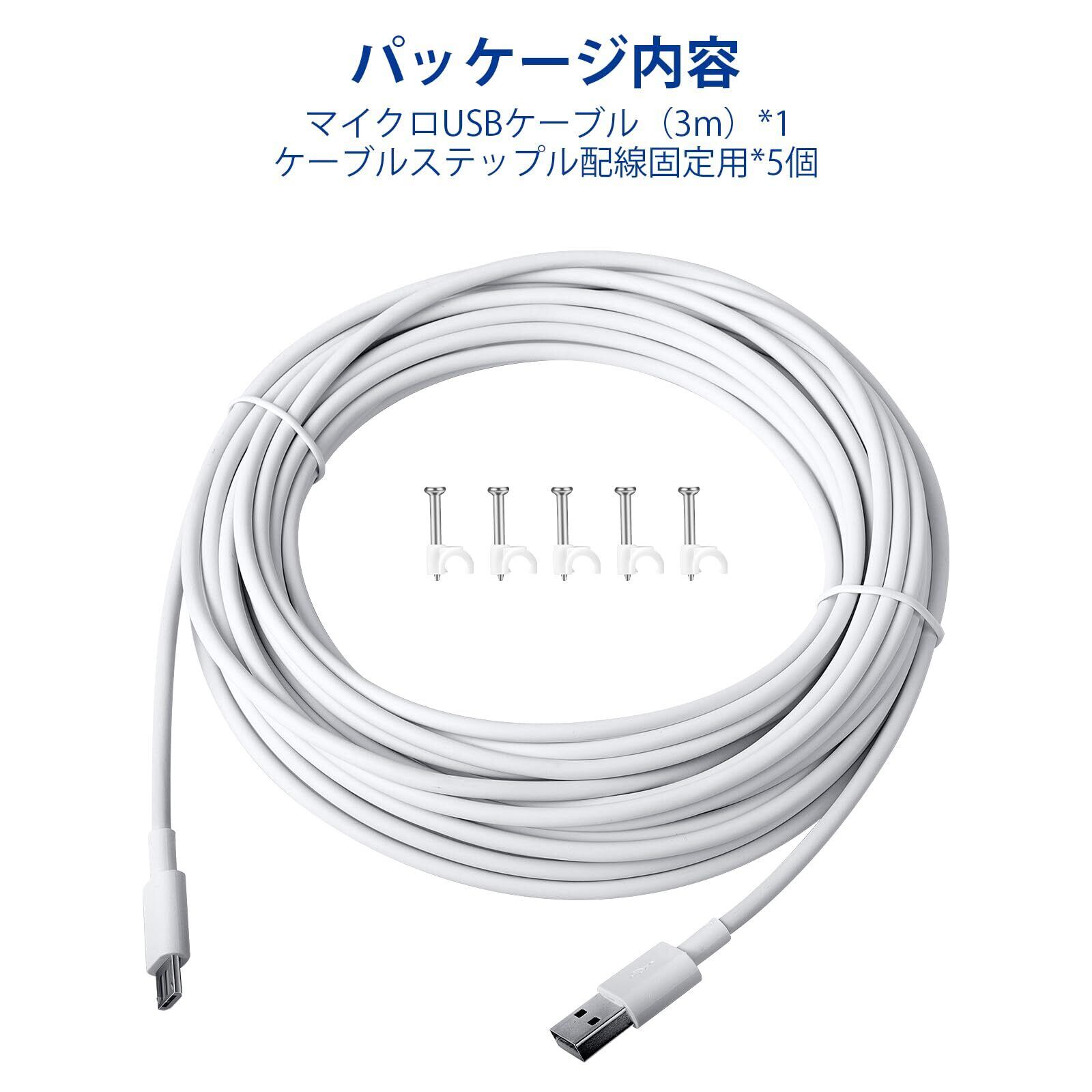 パッケージ内容:USB A to Micro usb 電源ケーブル*1本 白 (3M),ケーブルステップル配線固定用*5個。(本製品は防犯カメラに給電・充電専用のUSBケーブルです。データ転送を対応しません。ご購入前ご愛機の接続ポートをmicro USB端子であることを確認する必要です。他のコレクターデバイスには適用されません。)