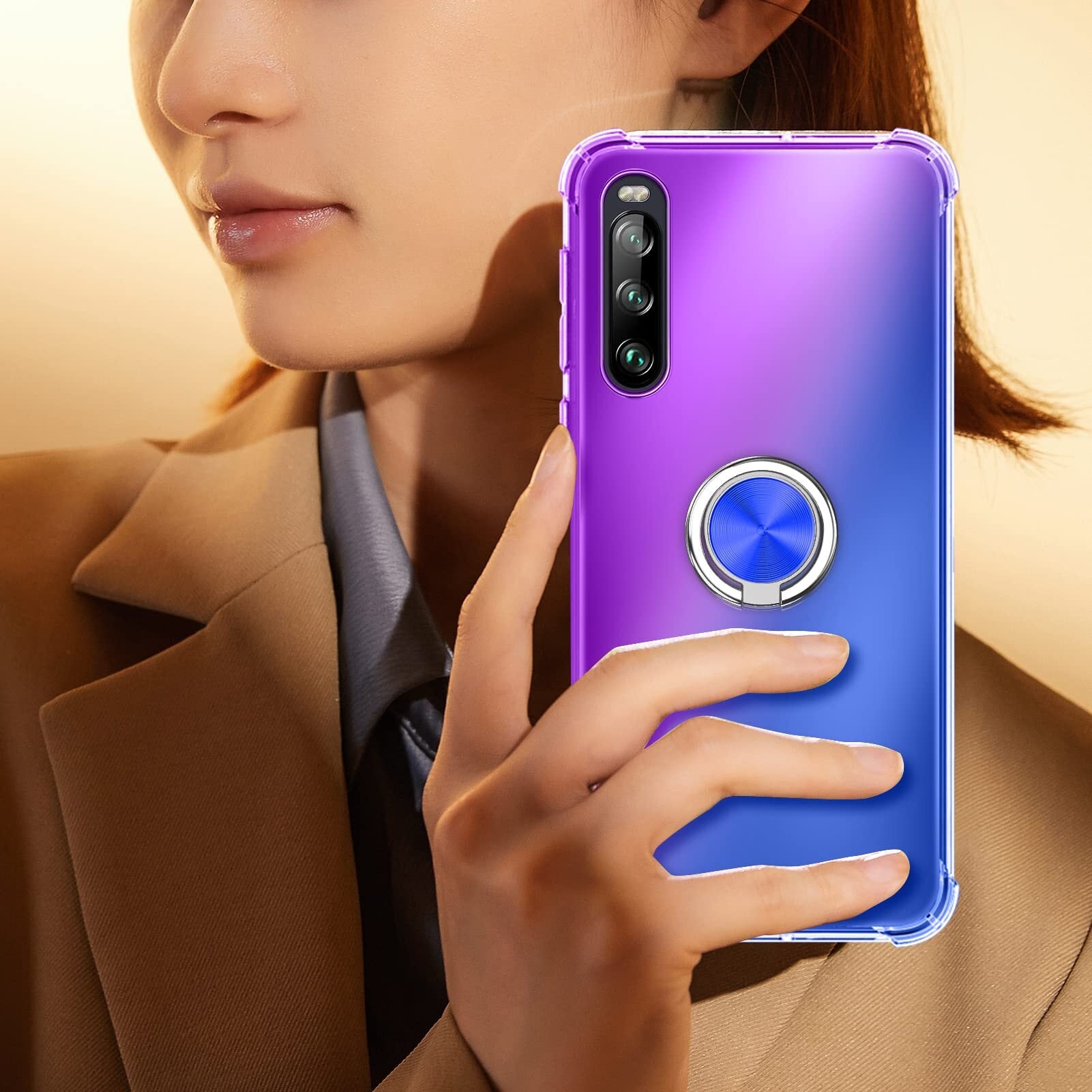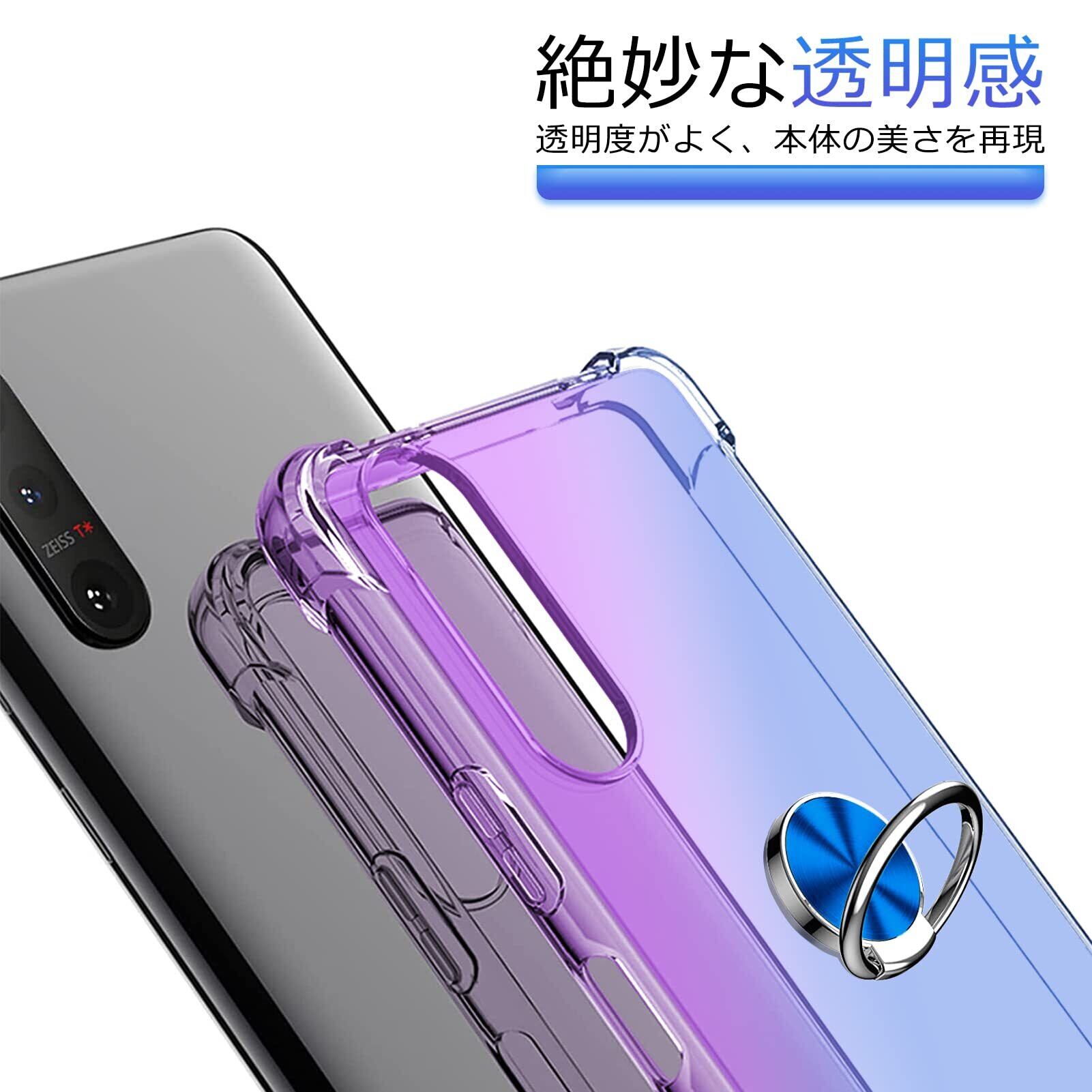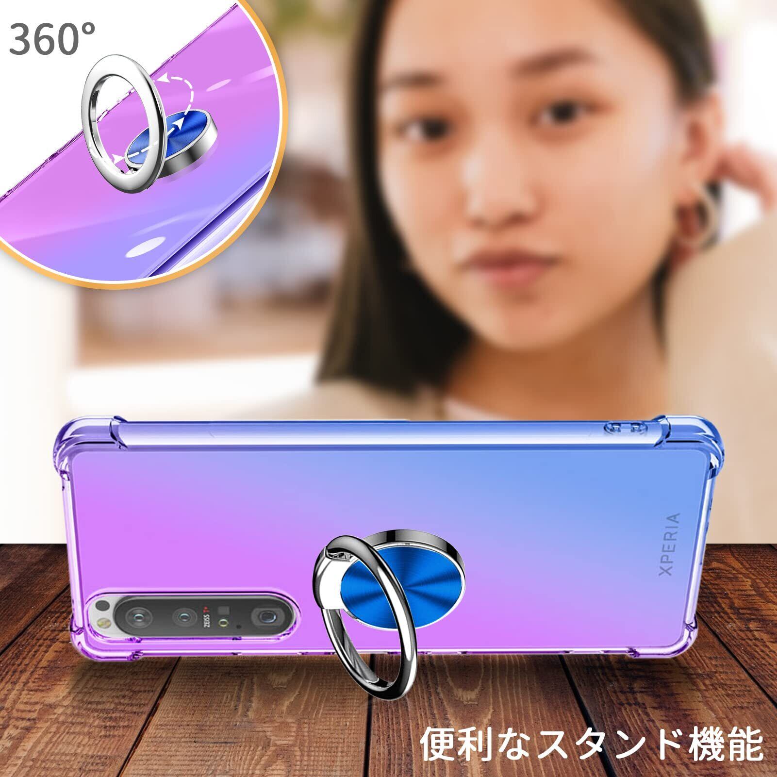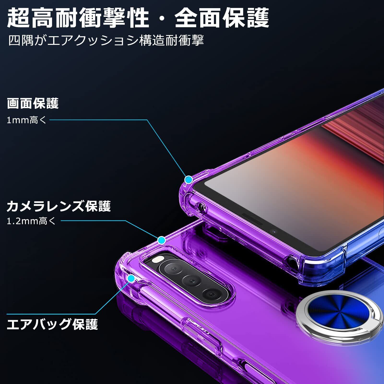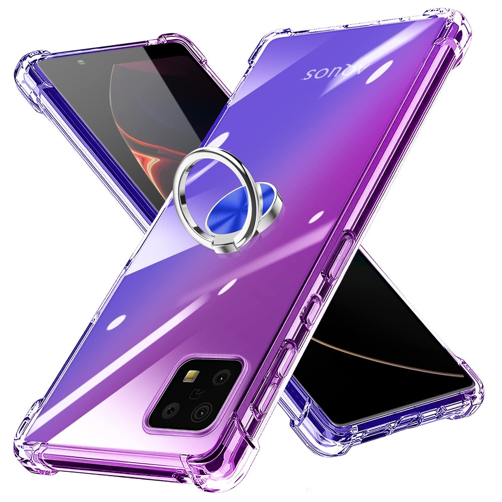 AQUOS Sense6 ケース リング 対応 SH-54B/SHG05 カバー TPU 薄型 リング付き 回転リング 車載ホルダー対応 ケース 黄変防止 耐衝撃 滑り止め 指紋防止 カメラ保護 TPU カバー 紫+青N408-sense6-02