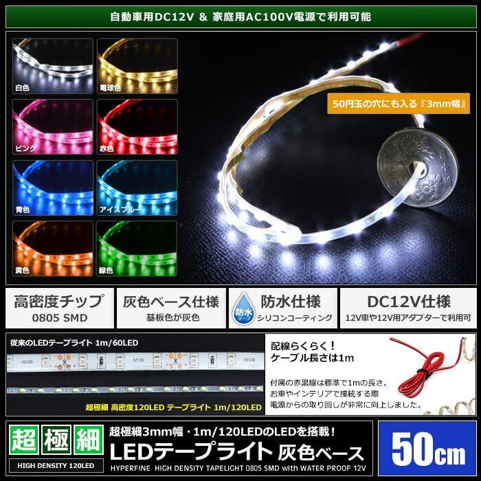 【外形寸法】テープ長:50cm/テープ幅:約3mm/テープ厚:約2mm/ケーブル長:約1m/赤いコードがプラス(+)極、 黒いコードがマイナス(-)極です。【仕様・諸元】LED仕様:0805SMD/入力電圧:DC12V/基板色:灰色ベース/消費電力(1mあたり):約6.0W/電流値(1mあたり):約0.5A/LED数(1mあたり):120灯(2.5cm単位で3基のLED)/電源線:片端子