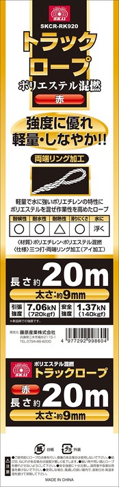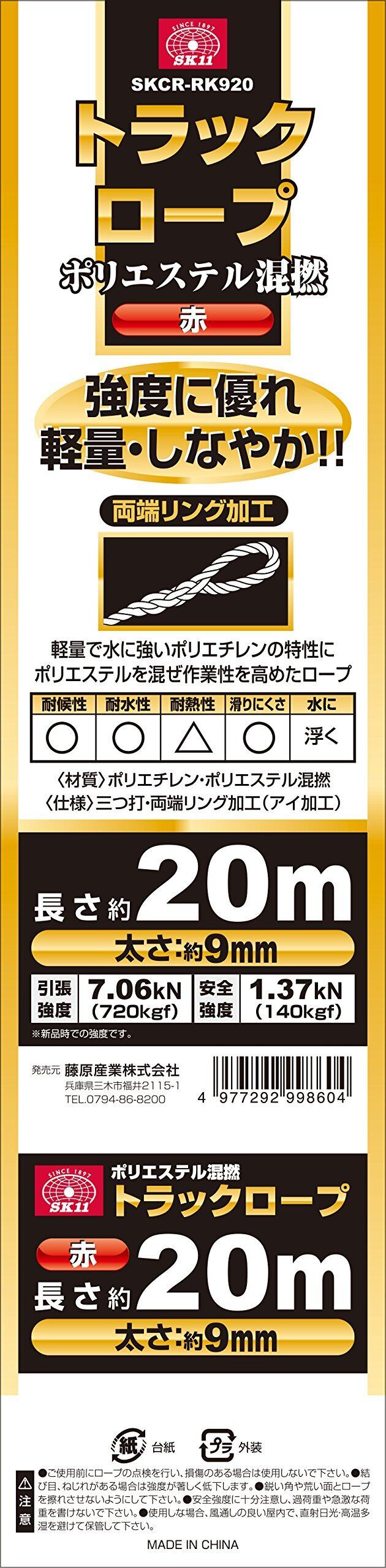 SK11(エスケー11) カラートラックロープ混撚 赤 9mm×20m 両端リング加工 SKCR-RK920