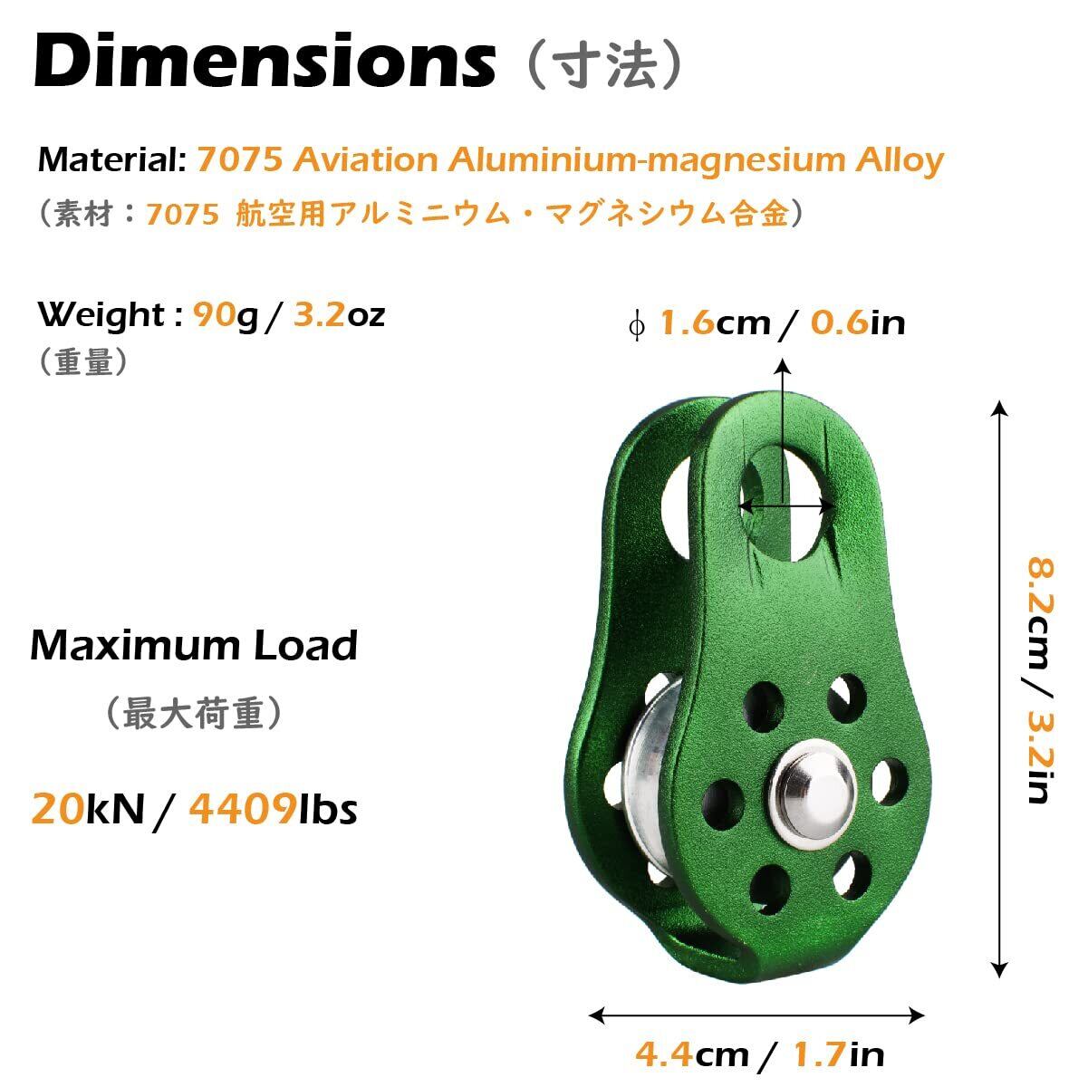 【軽量&高強度】本体には高強度の7075航空アルミ合金を使用し、わずか約90gの軽量設計。サイズは約4.4×8.2cmで、手のひらに収まるコンパクトなマイクロプーリーです