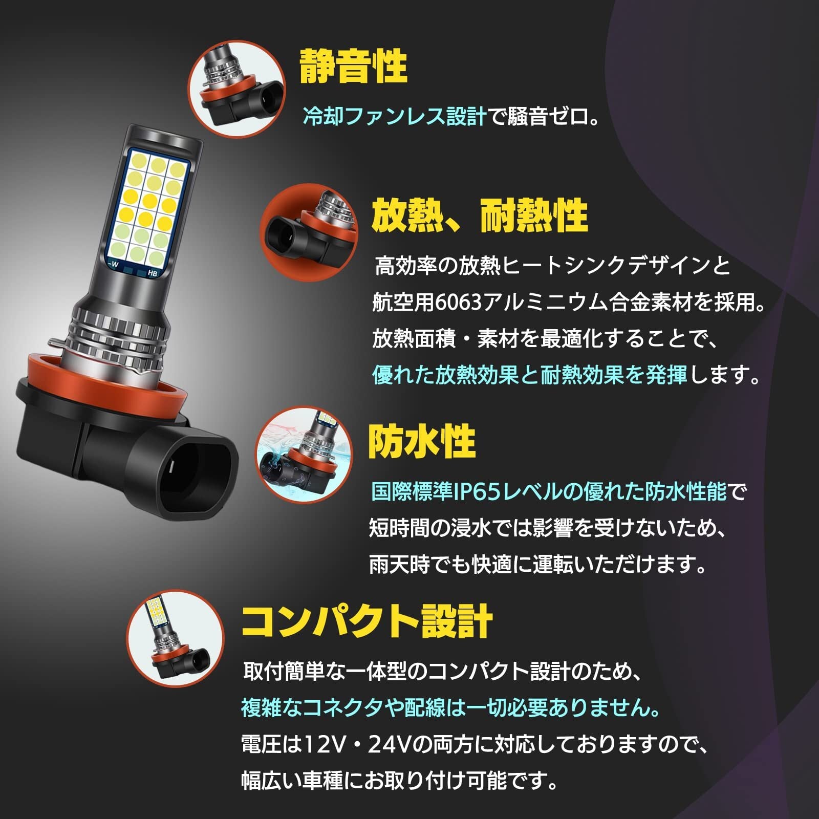【セット内容】LEDフォグランプ×2 【バルブ規格】HB4、H8/H11 【LED発光色】イエロー光(3000K)、ホワイト光(6000K)、ライムグリーン光(4100K)、アイスブルー光(10000K)、ブルー光(15000K)、ピンクパープル光(30000K) 【電圧】DC12V-24V 【光量】4800Lm(=2400Lm×2個) 【消費電力】20W/個 【LEDチップ】3030SMDチップ 【LEDチップ数】36枚(片側18枚) 【寿命】約50000時間 【防水等級】IP65 【動作環境】-40℃~+105℃【材質】航空用6063アルミニウム合金