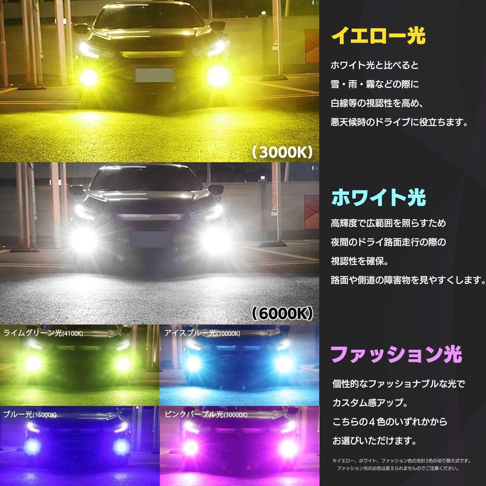【高輝度SMDチップ搭載&3色切り替え可能】高品質のハイパワーLEDチップ3030SMDを採用することで、高輝度・低消費・長寿命を実現。全光束4800Lmの明るさで純正ハロゲンより明るく照射し、視認性が向上します。色温度は天候や気分に合わせてスイッチをON/OFFするだけで、イエロー(3000K)・ホワイト(6000K)・ライムグリーン(4100K)/アイスブルー(10000K)/ブルー(15000K)/ピンクパープル(30000K)に切り替え可能です。夜間のドライ路面では路面や側道の障害物を見やすくするホワイト光(6000K)、雪・雨・霧などの悪天候には視認性の高いイエロー光(3000K)、ファッショナブルな光を発するライムグリーン光(4100K)/アイスブルー光(10000K)/ブルー光(15000K)/ピンクパープル光(30000K)で事故防止・快適運転をサポートします。