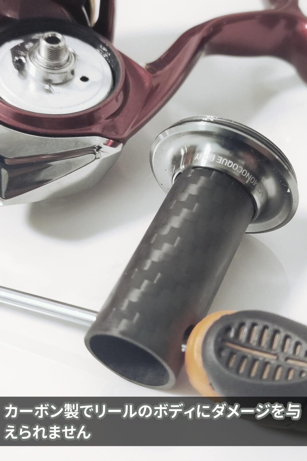 【素材】カーボン製のおかげで、通常の金属製よりリールを分解する際に、リールのボディにダメージを与えられません。金属が固くて、ダイワのモノコックボディスに傷つけやすくて、カーボン製にさせていただきました。